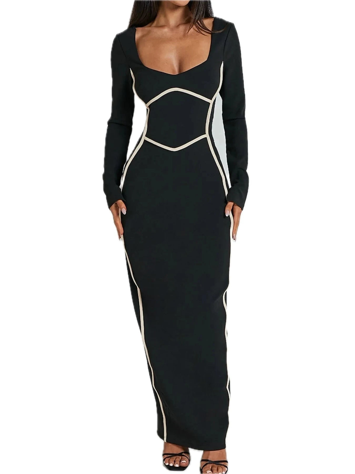 Women's Contrast Trim Long Sleeve Bodycon Maxi Dress Backless Tied Design Stretch 95% Polyester and 5% Spandex