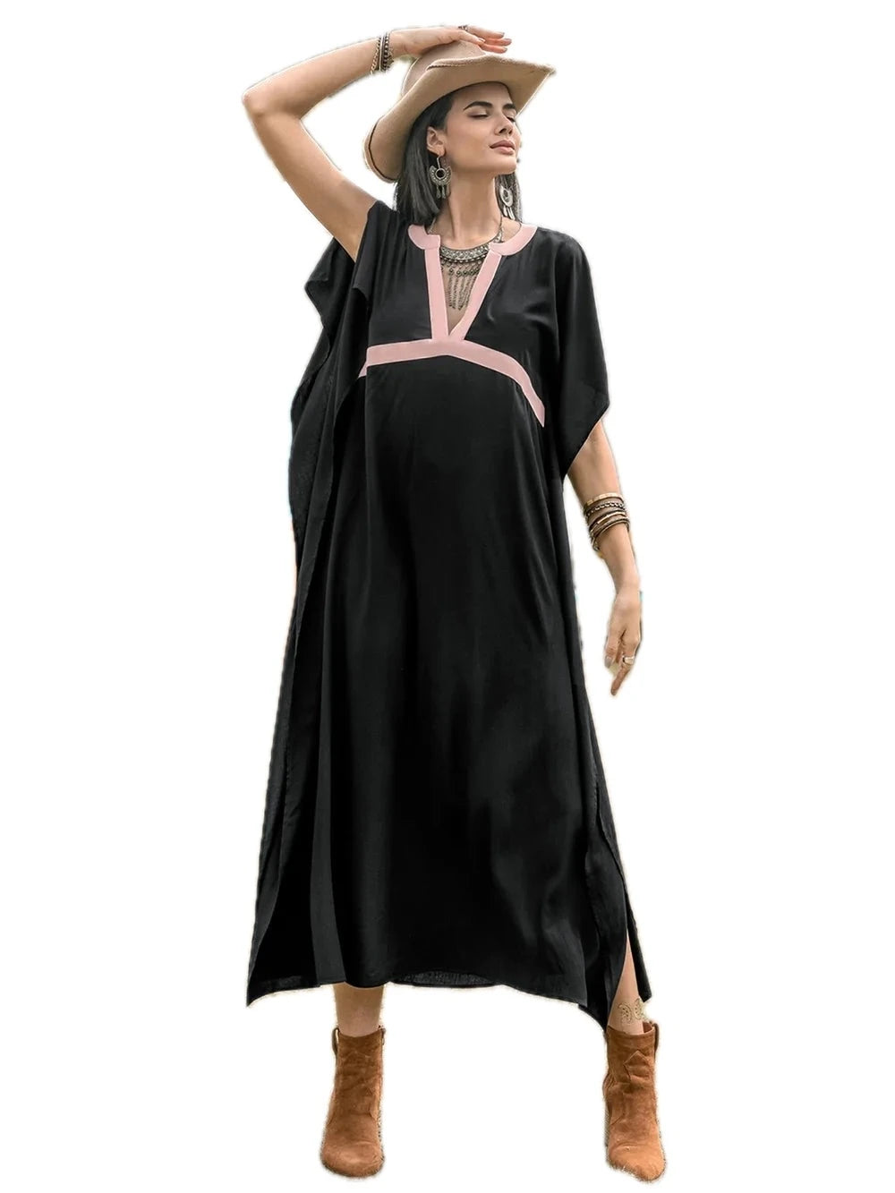 Women's Contrast Trim Notched Slit Short Sleeve Midi Dress 100% Viscose for Elegant Everyday Wear for Day to Night Looks