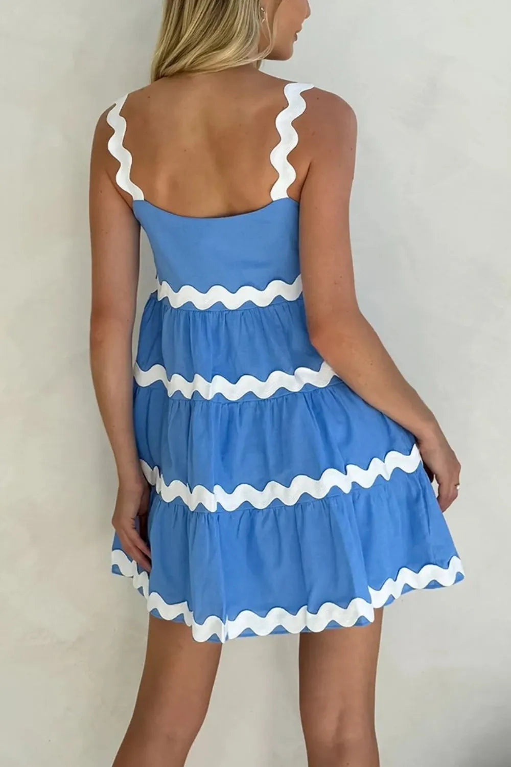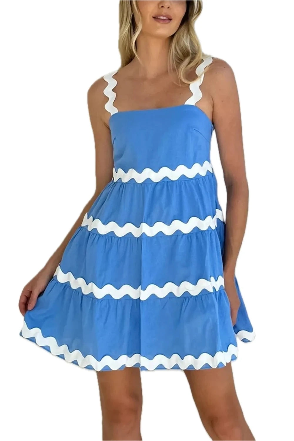 Women's Contrast Trim Square Neck Tiered Dress with Ruched Details 100% Polyester Fabric for Elegant Occasion Ready