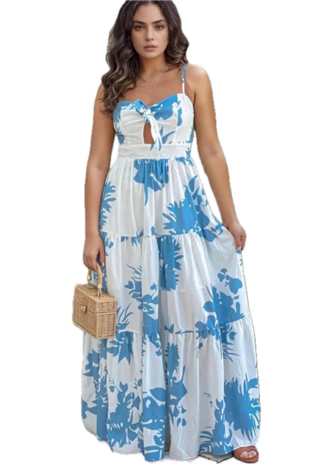 Women's Cut-Out Sweetheart Neck Maxi Dress with Tie Detail and Tiered Silhouette 100% Polyester for Special Occasions