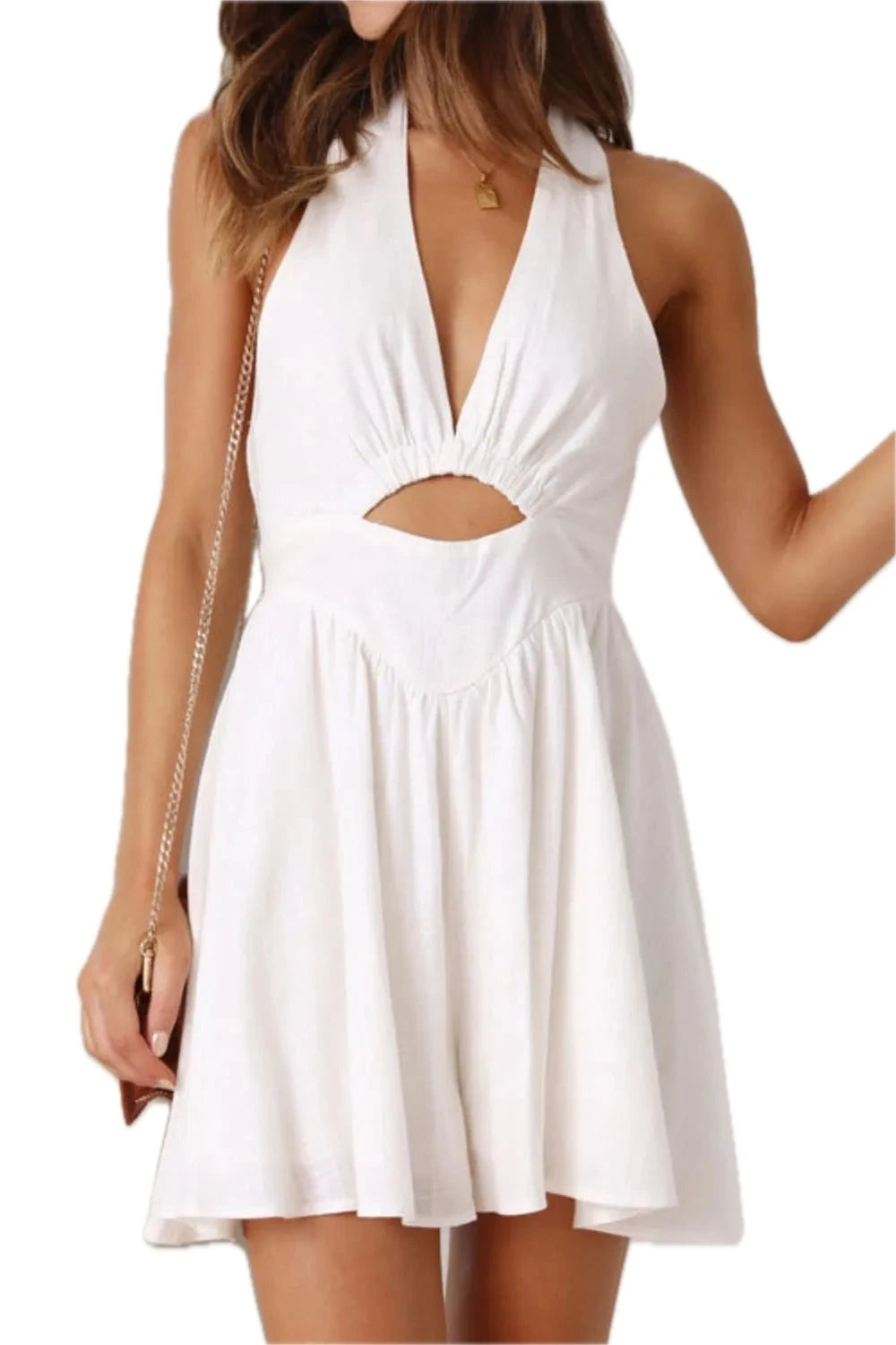 Womens Cutout Halter Neck Mini Dress with Tied Back and Ruched Bodice Breathable Lightweight 90% Cotton 10% Linen Lined