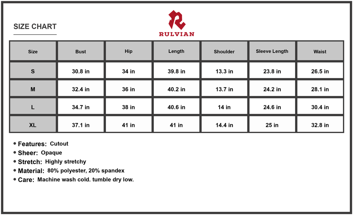 S: bust 30.8 in, shoulder 13.3 in, waist 26.5 in, hip 34 in, sleeve length 23.8 in, length 39.8 in