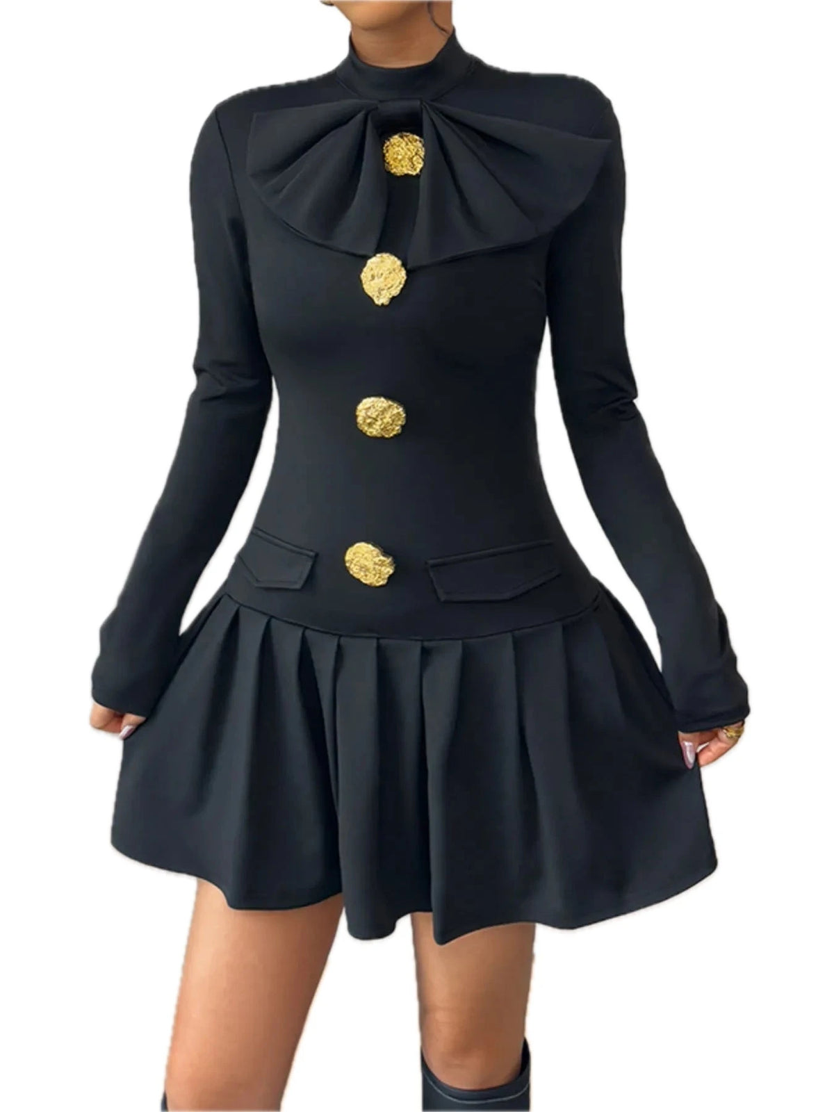 Women's Decorative Button Mock Neck Long Sleeve Mini Dress with Ruffles and Stretch 95% polyester 5% elastane today