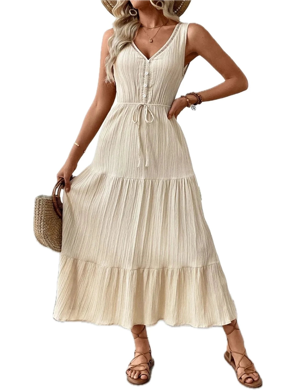 Women's Decorative Button V Neck Sleeveless Midi Tank Dress with Ruched Tie Details 80% viscose 20% polyamide Fabric