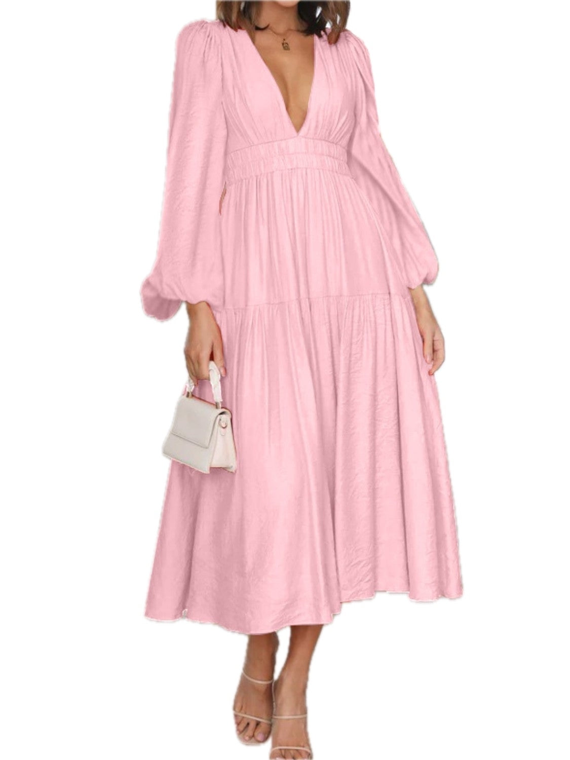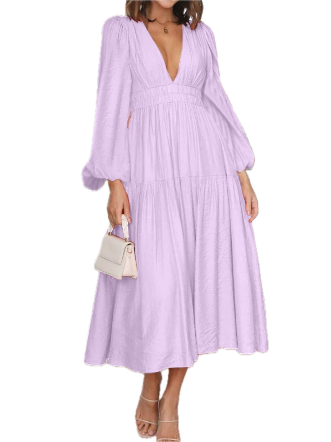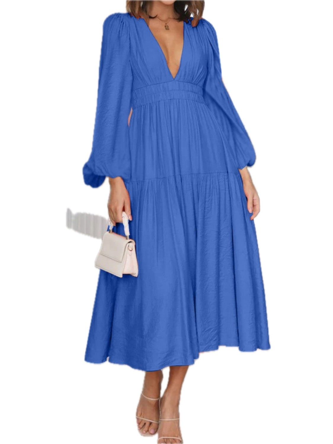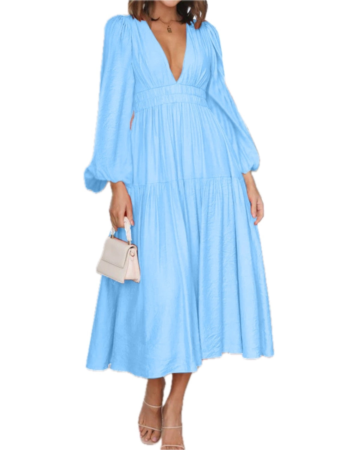 Women's Deep V Neck Balloon Sleeve Maxi Dress 100% Polyester Fabric Elegant Evening Everyday Wear Silhouette Chic
