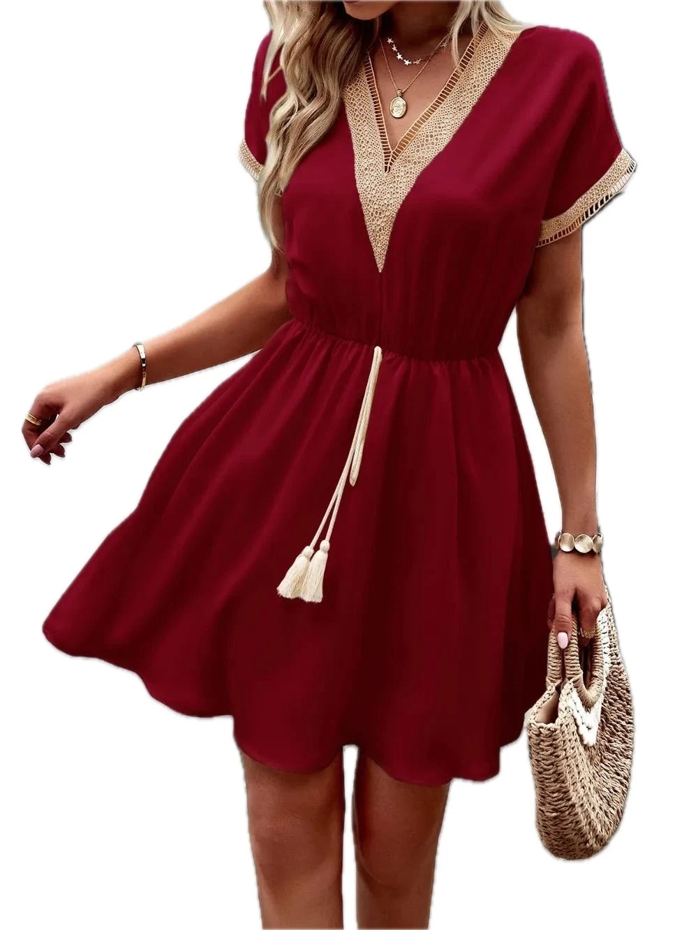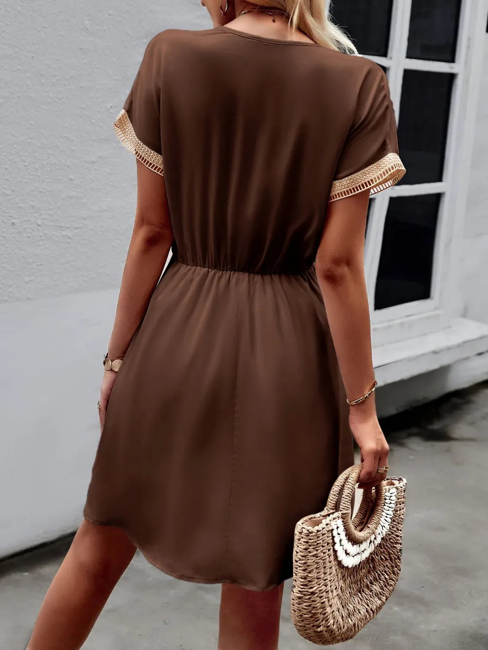 Women's V Neck Short Sleeve Mini Dress with Contrast Trim and Lace Detail 100% Polyester Fabric Elegant Comfort