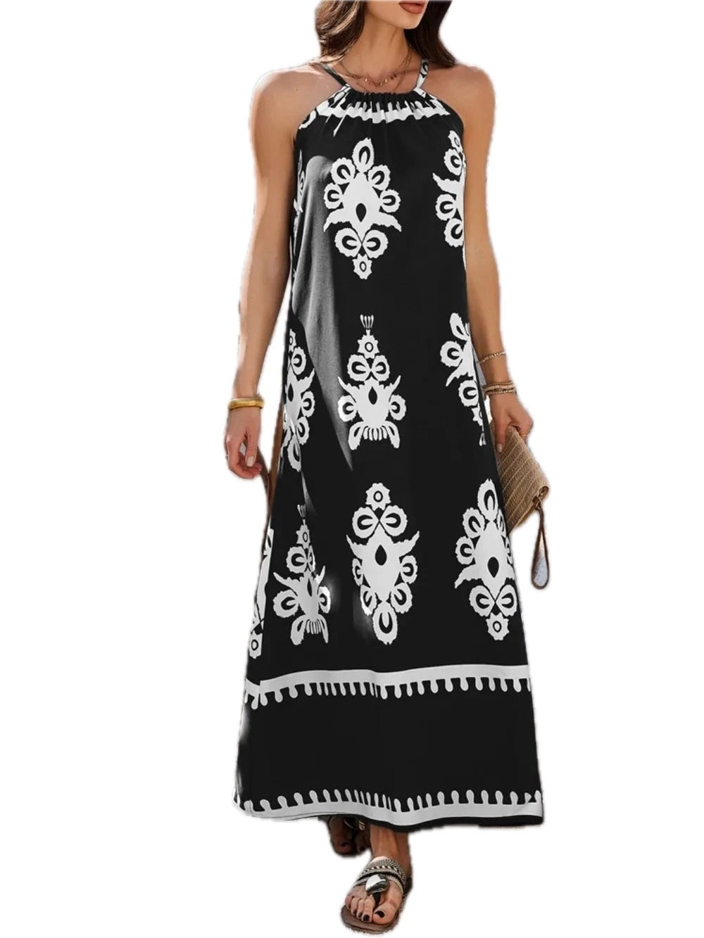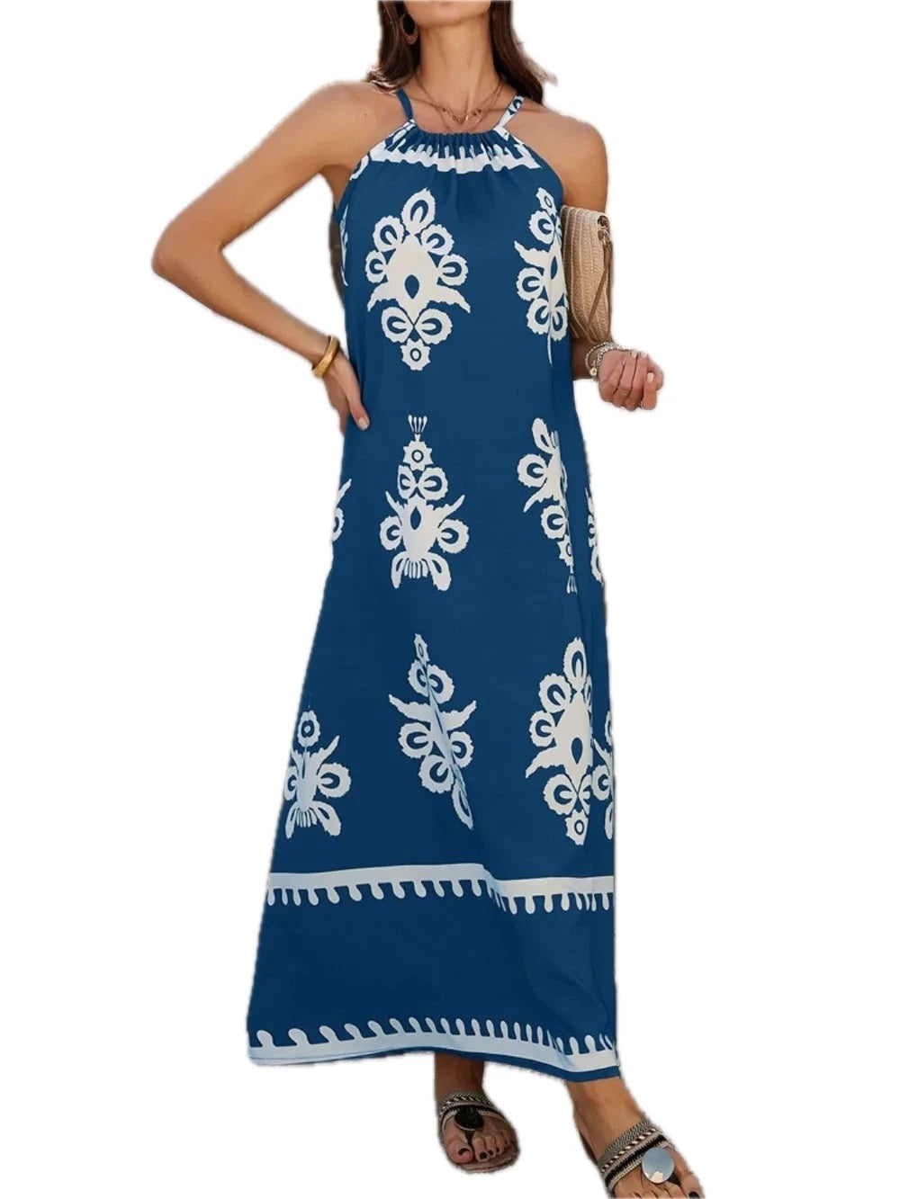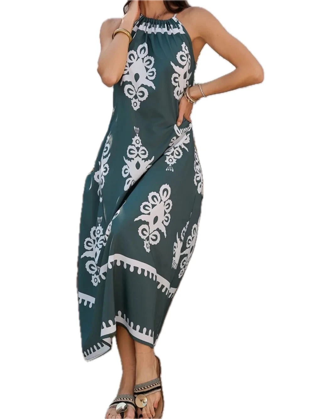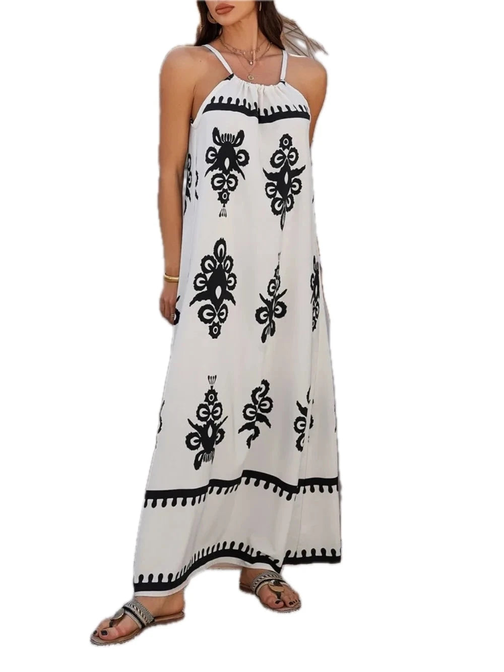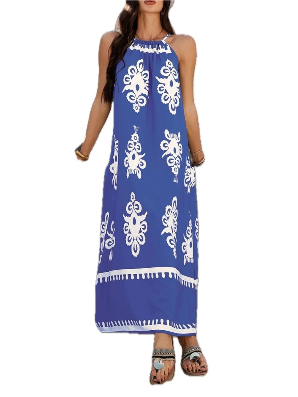 Women's Grecian Neck Printed Maxi Dress in 100% Polyester Fabric with Elegant Flowing Silhouette and Classic Print