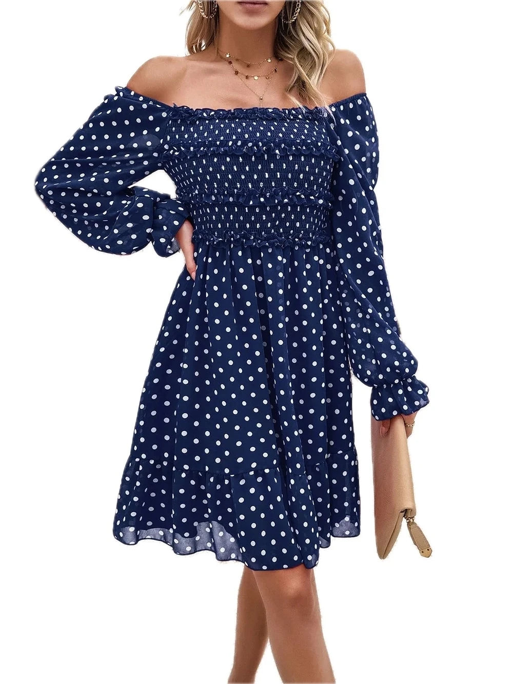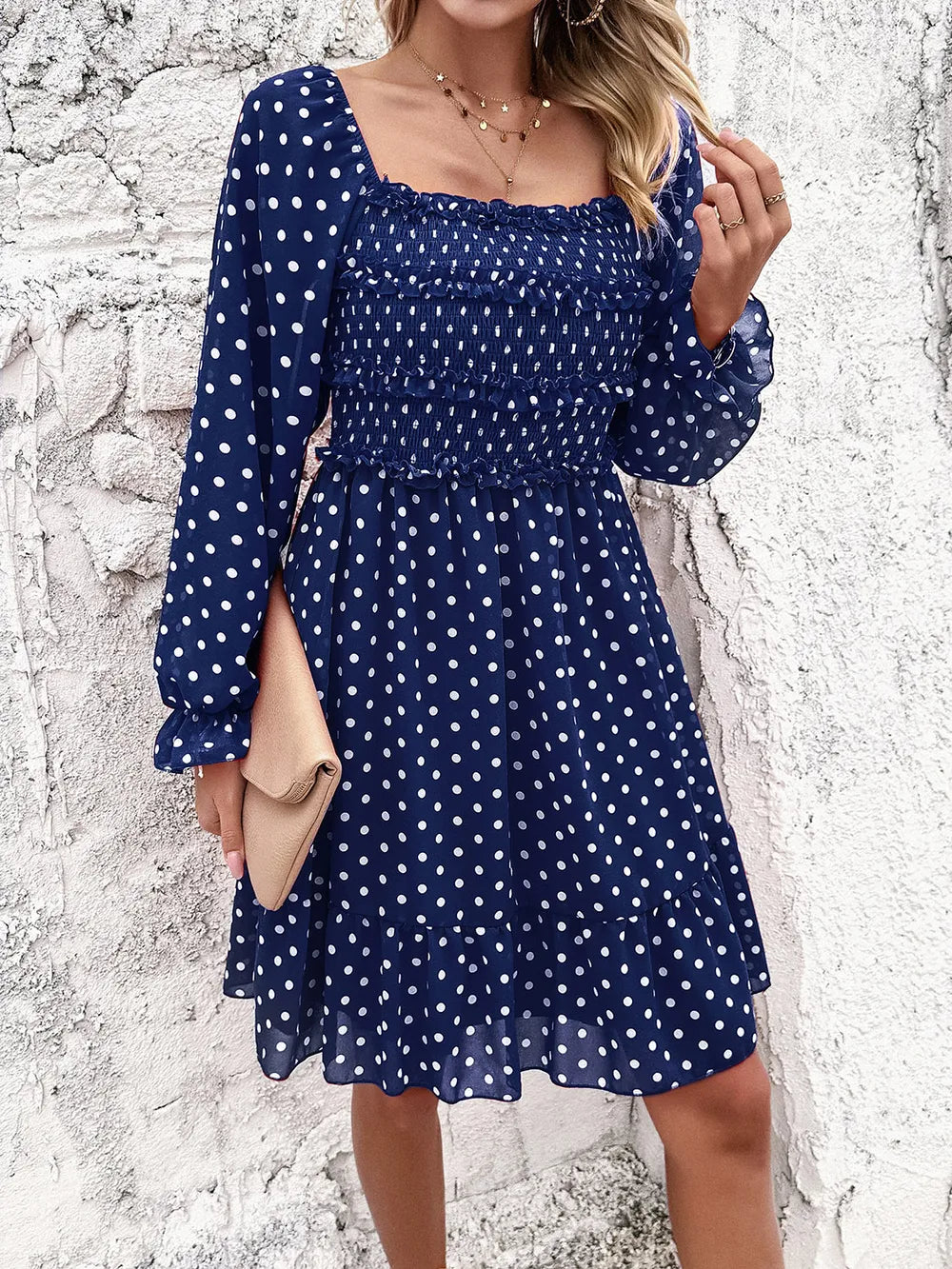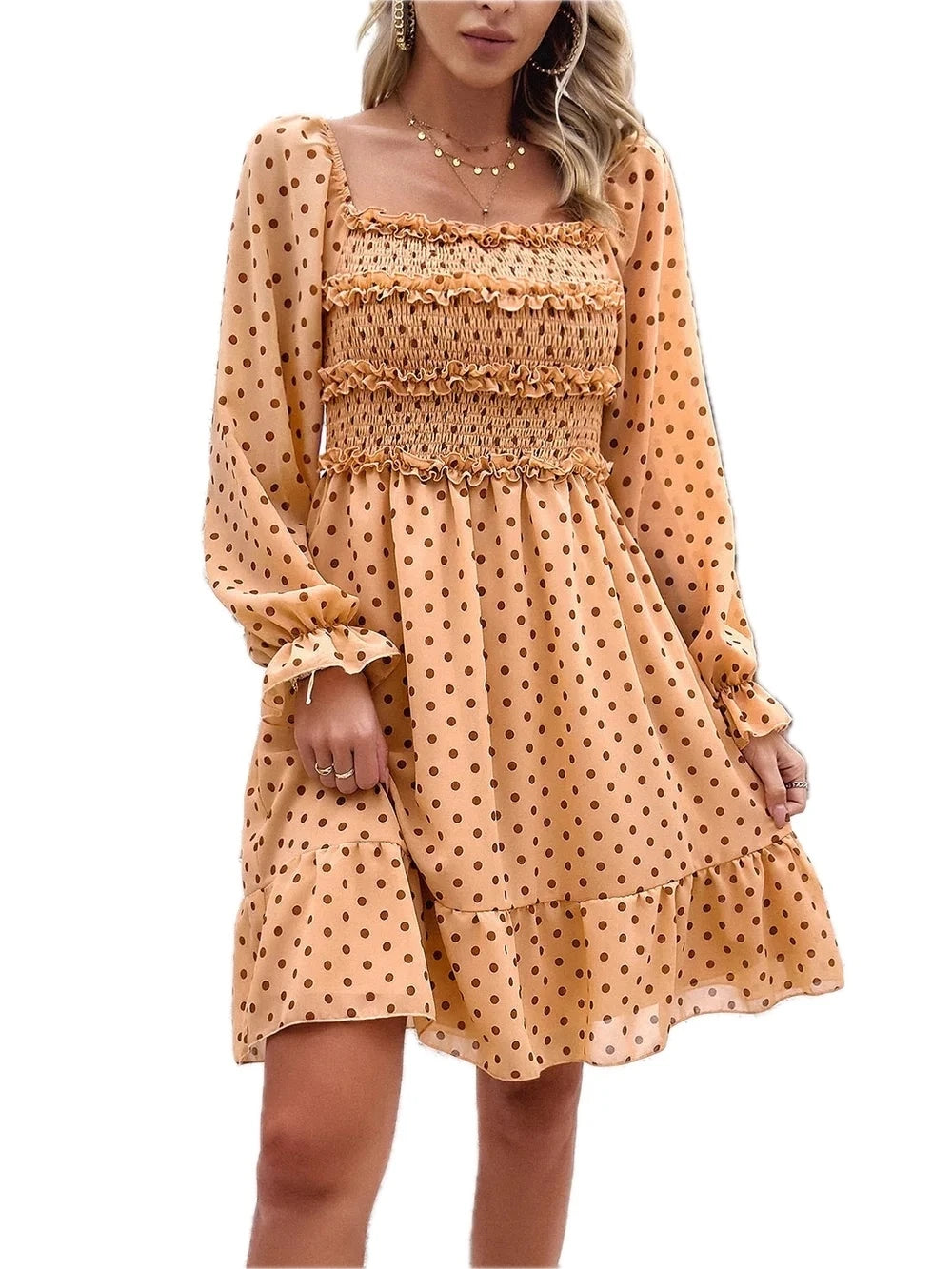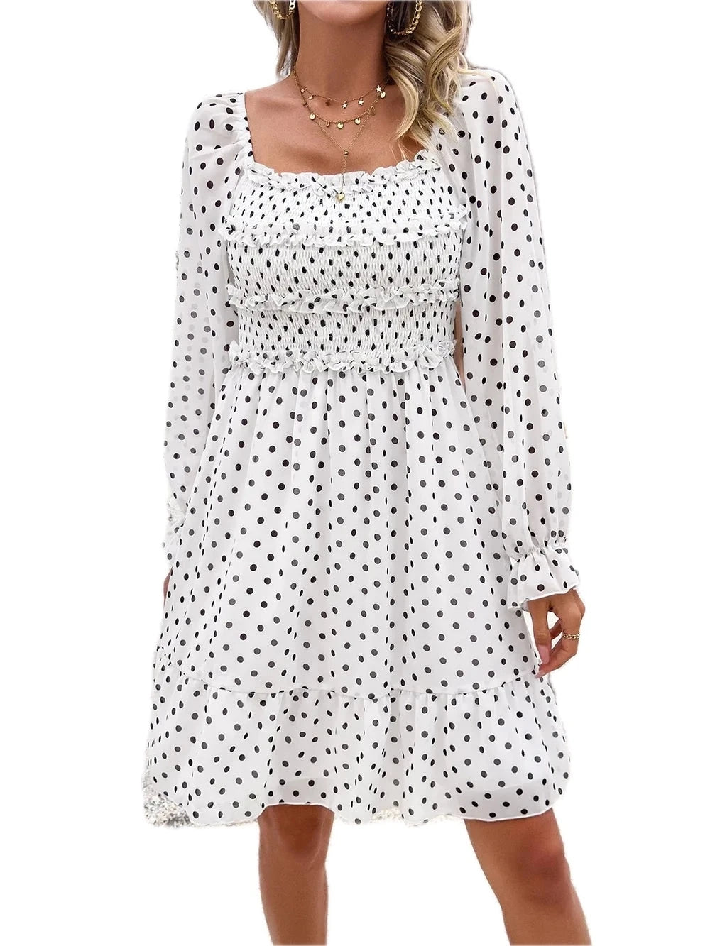Women's Smocked Polka Dot Long Sleeve Dress 100% Polyester Fabric with Sheer Bodice and Slight Stretch for Day to Night