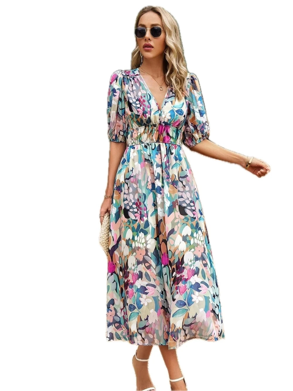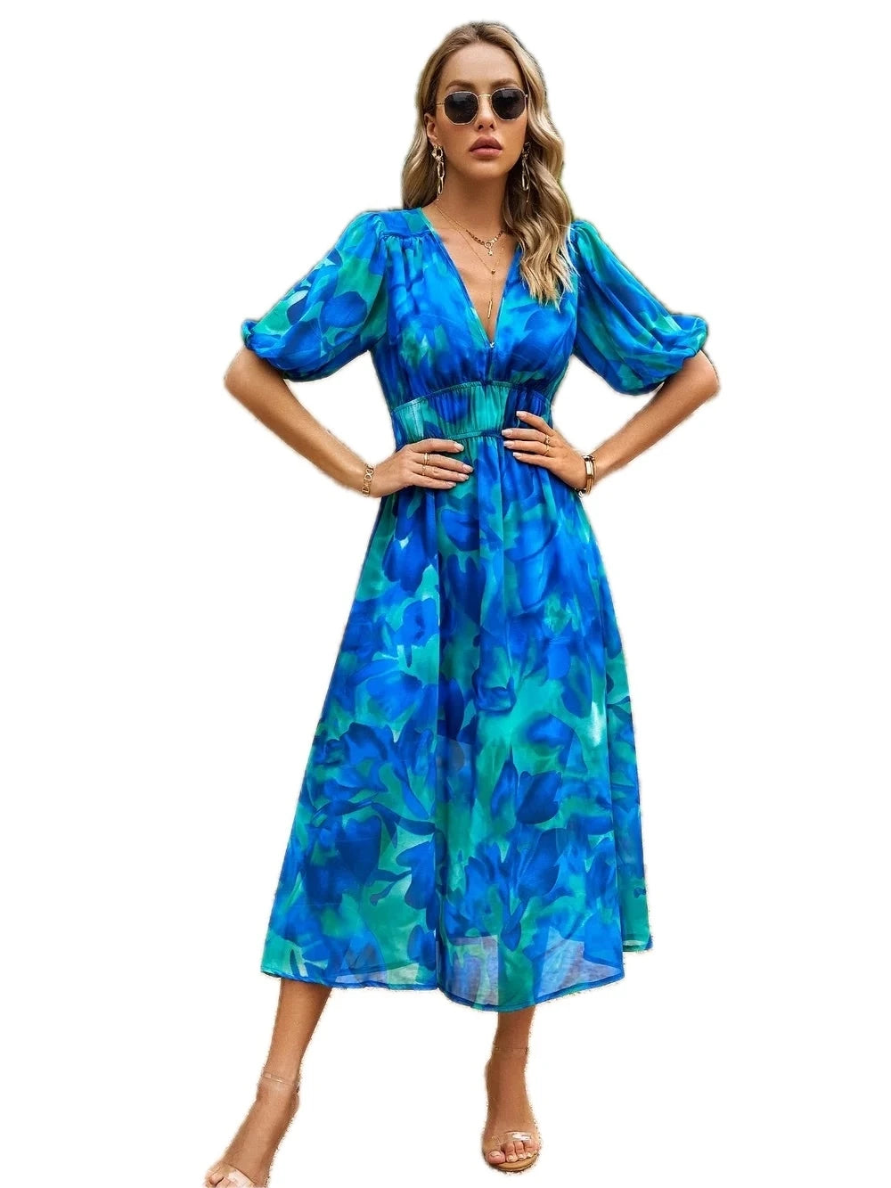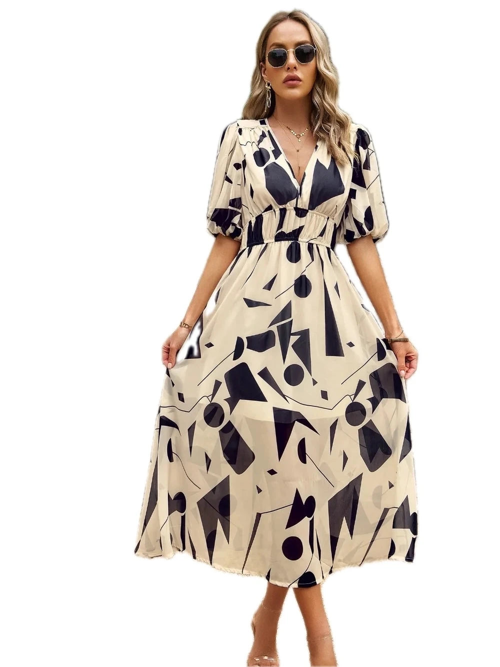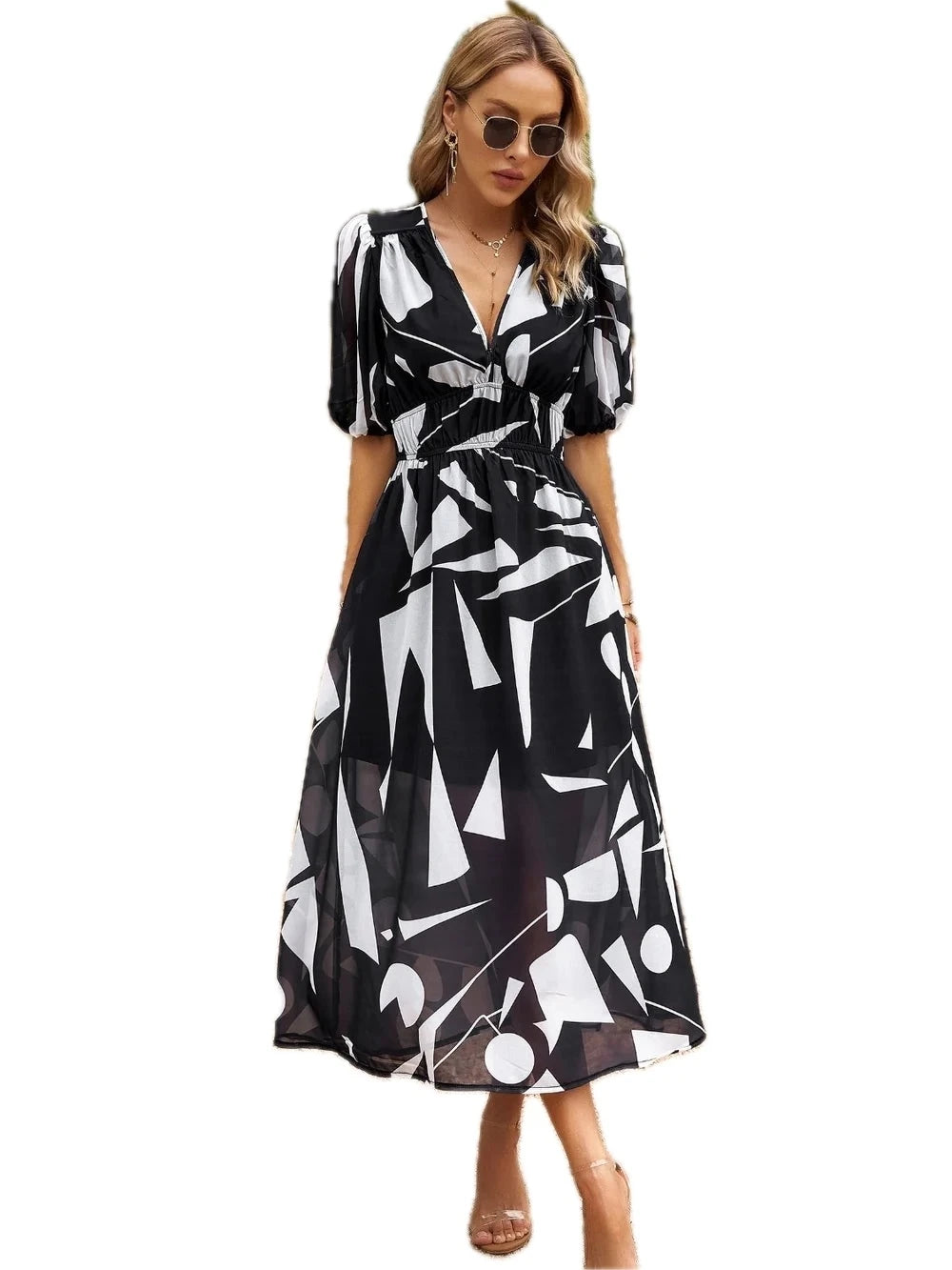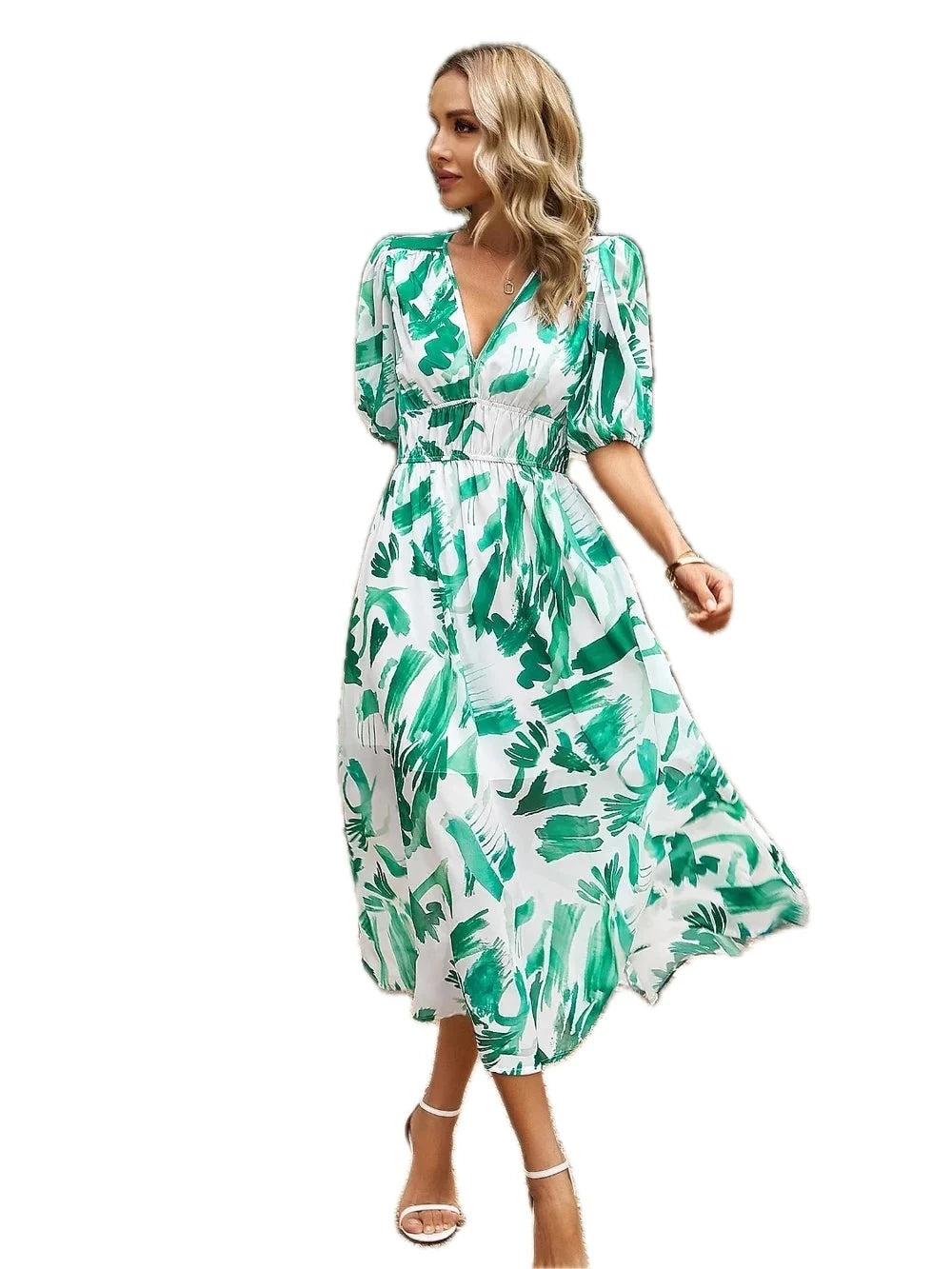 Women's Smocked Printed V Neck Half Sleeve Midi Dress with Sheer to Opaque Look for Daytime Wear 100% Polyester