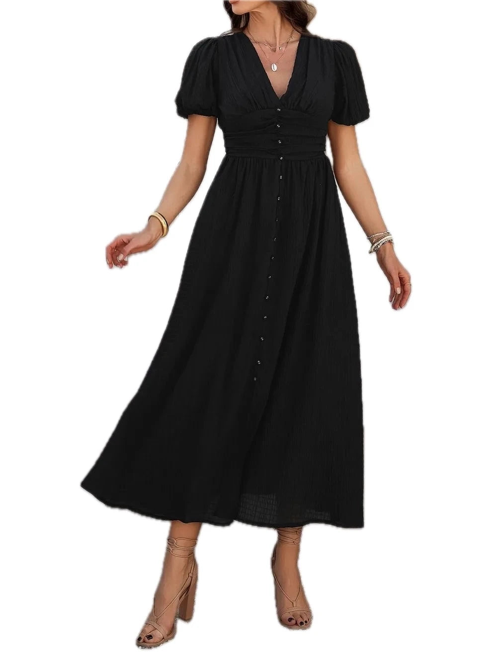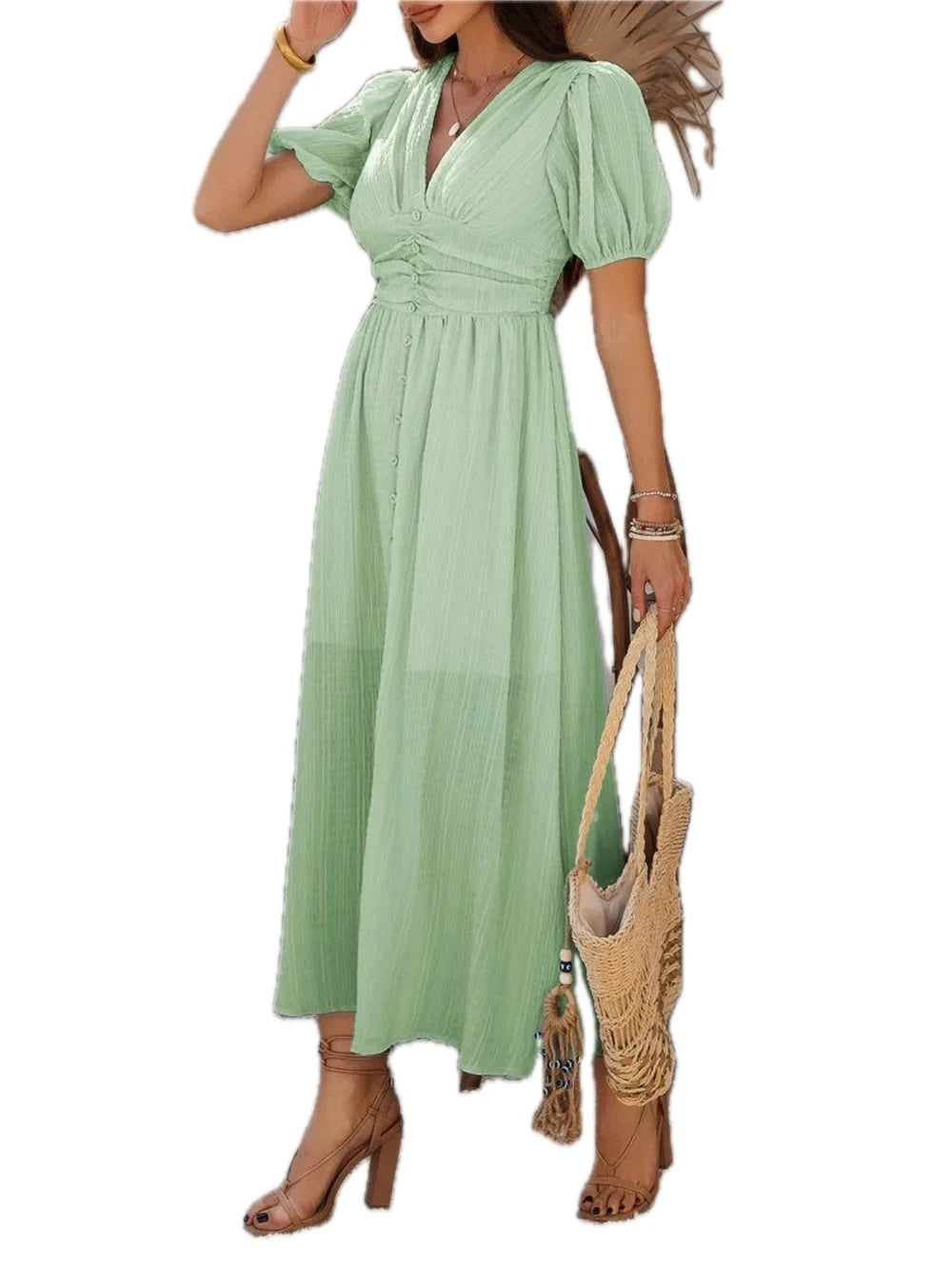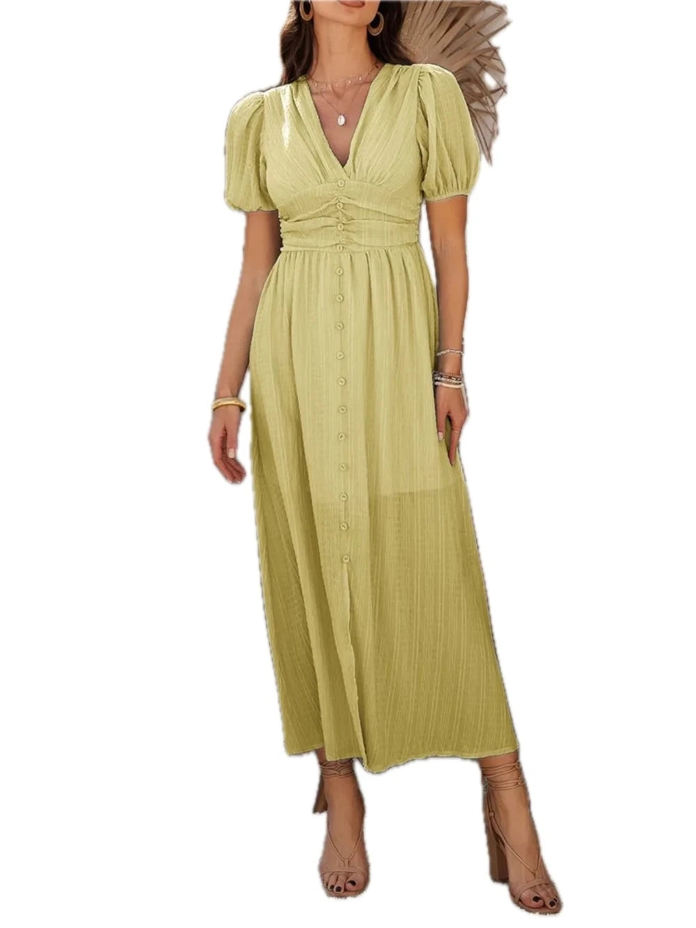 Women's V-Neck Puff Short Sleeve Midi Dress with Buttoned Ruched Slit and Lined Sheer Overlay 100% Polyester Fabric