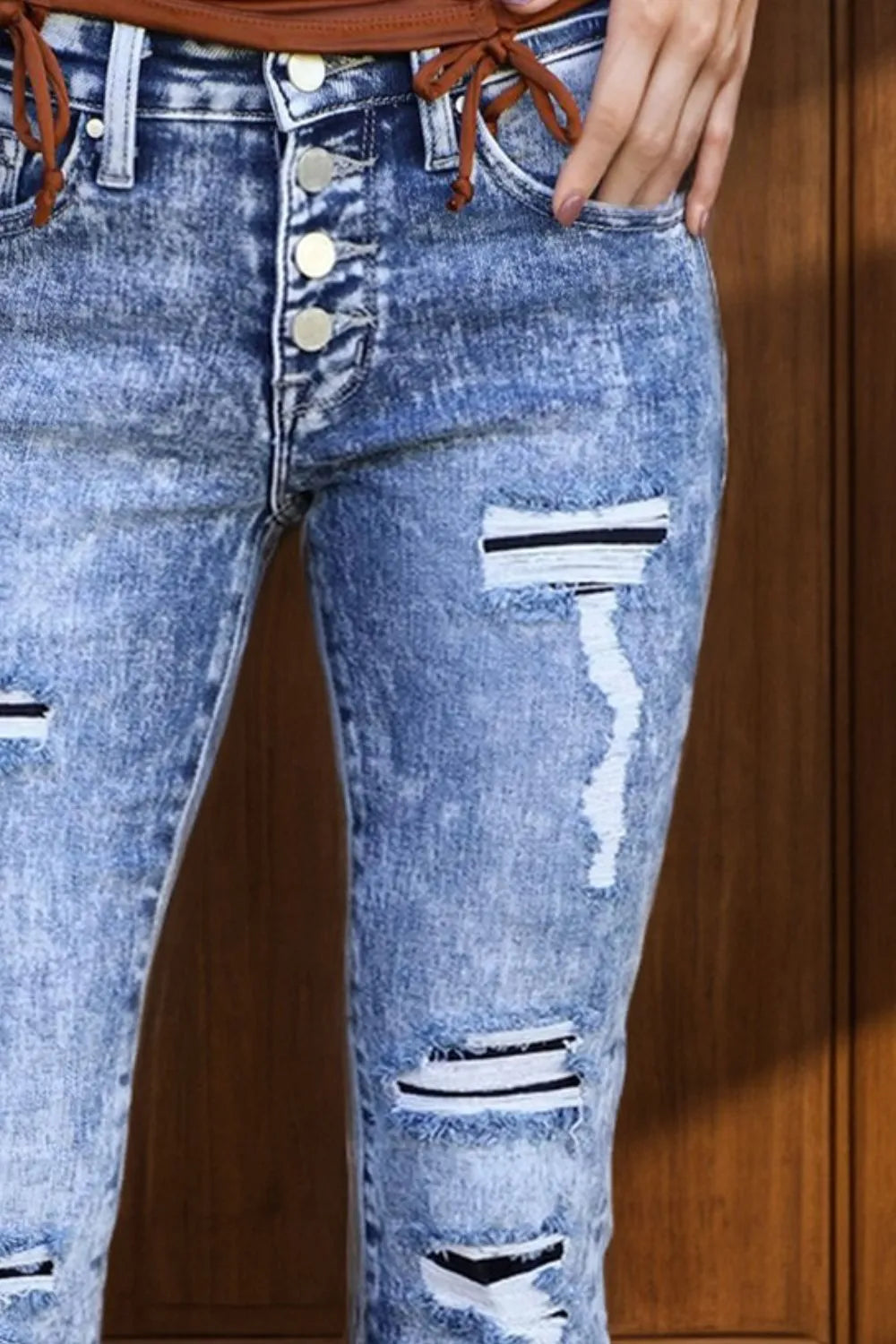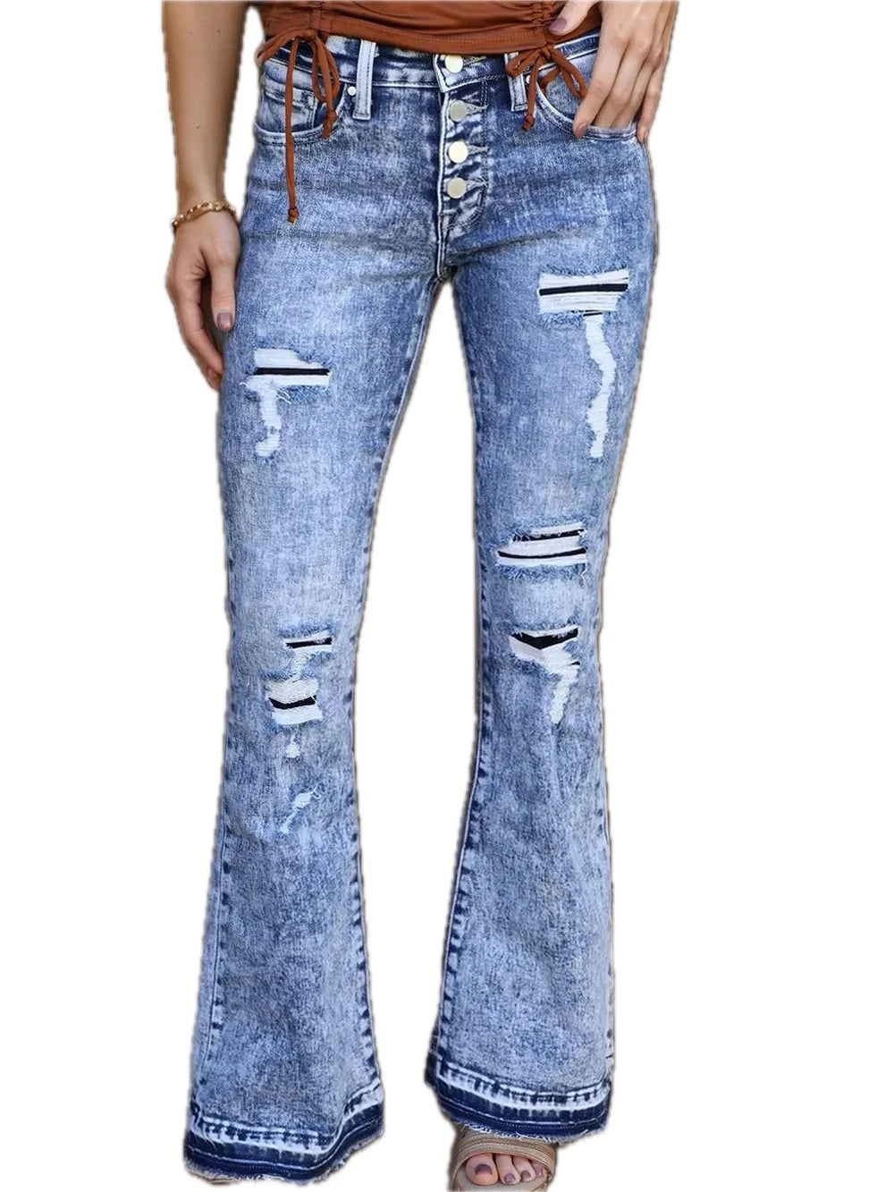 Womens Distressed Button Fly Bootcut Jeans Fringe Hem Five Pocket Design for Everyday Wear 65 Percent Cotton 35 Percent Polyester