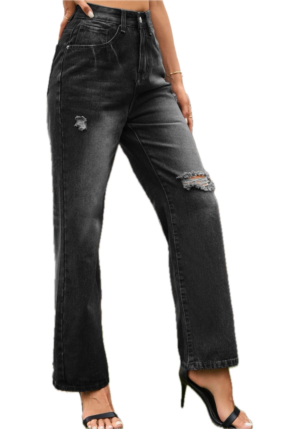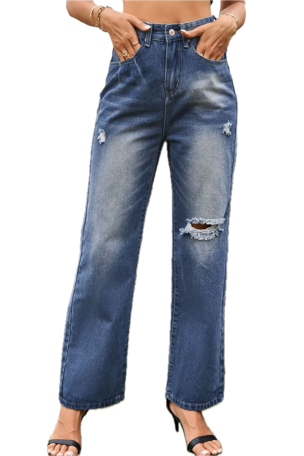 Womens Distressed Loose Fit Buttoned Denim Jeans for Casual Wear Long Length Durable Versatile Pants Solid Pattern