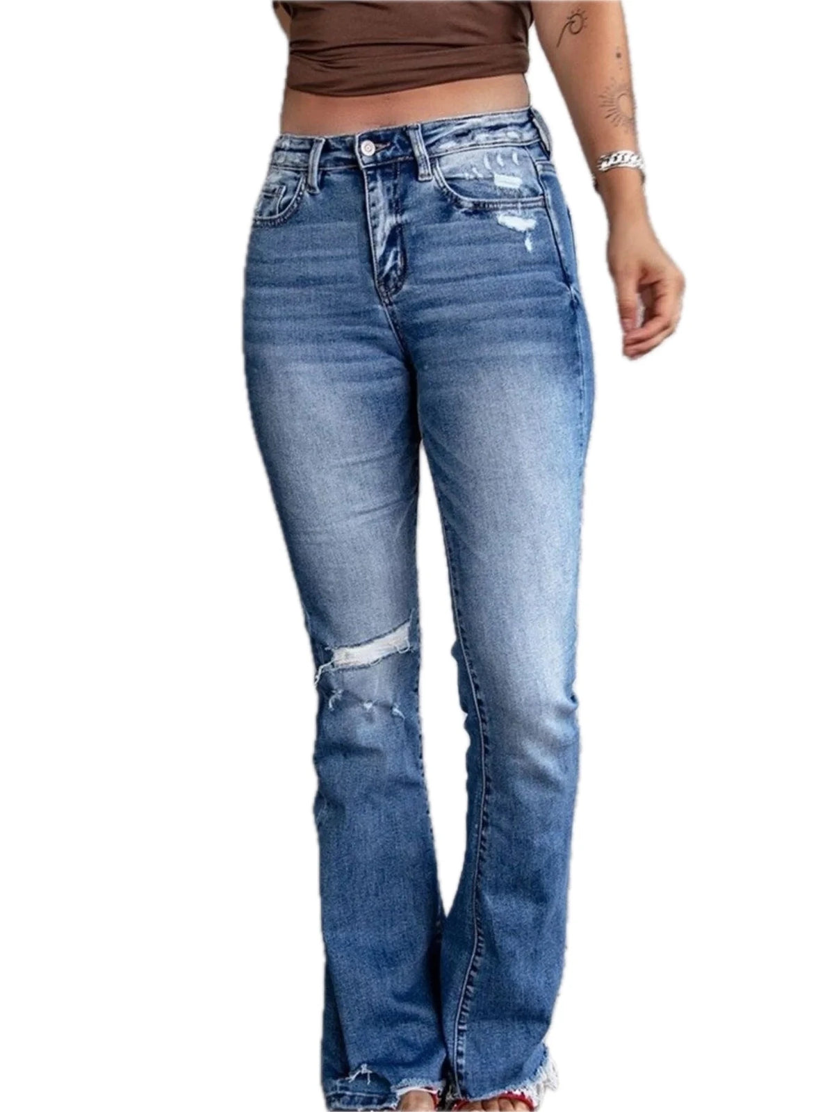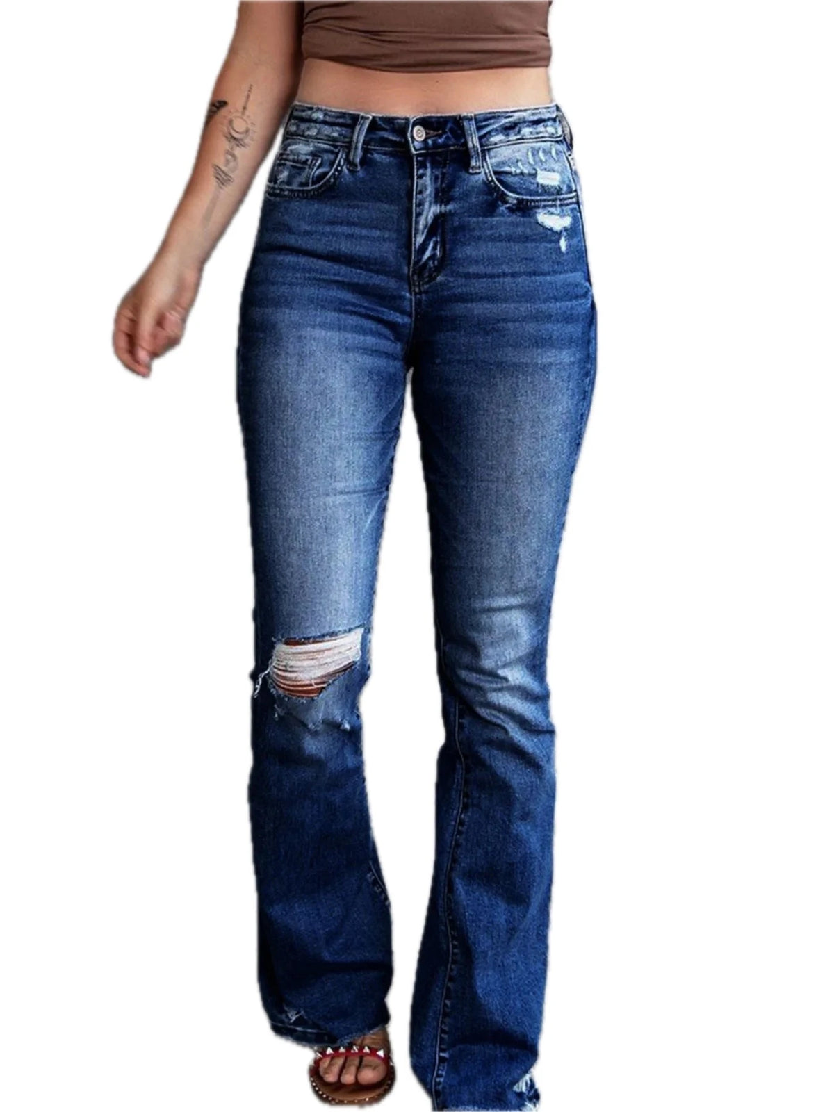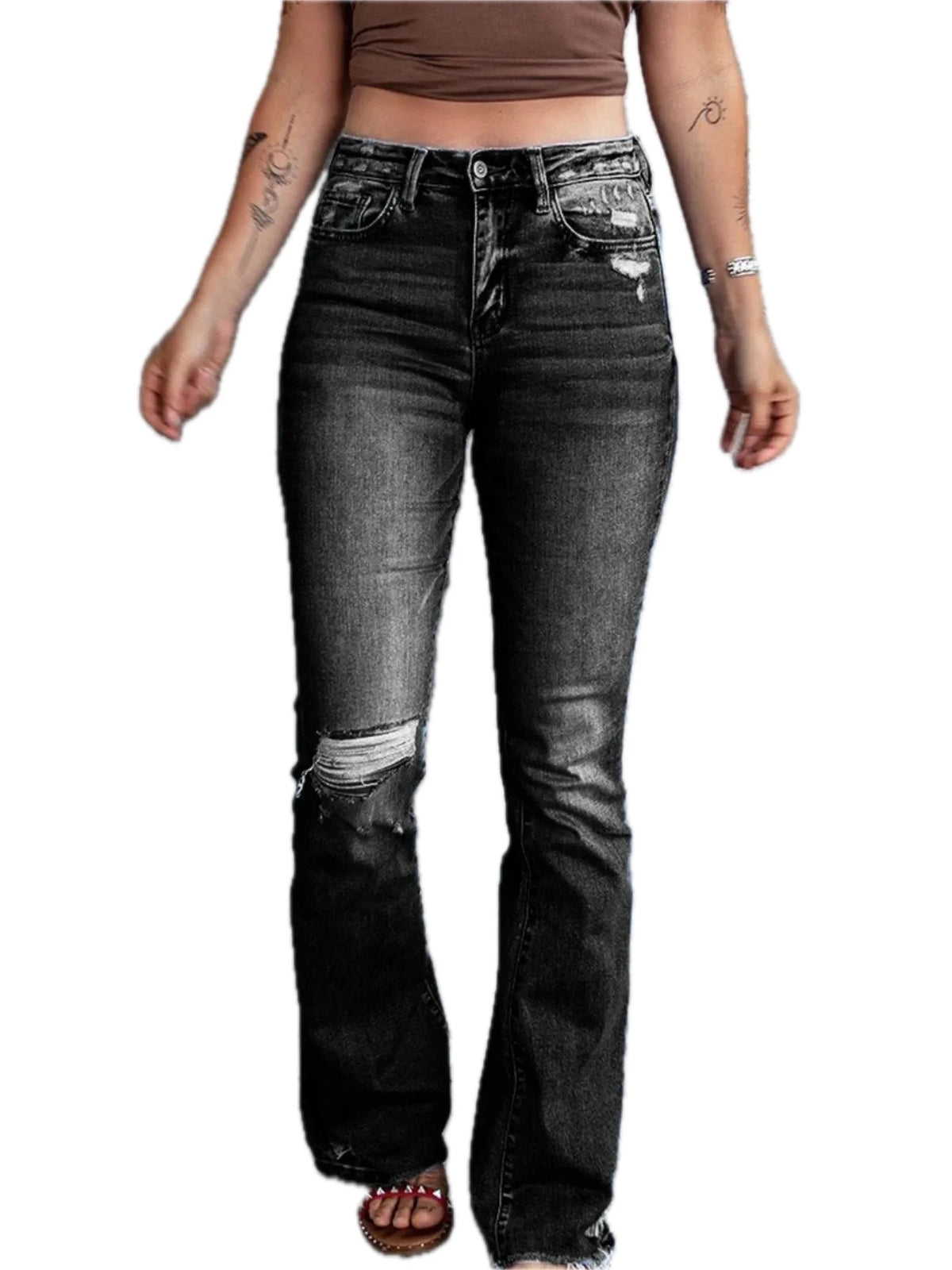 Women Distressed Flare Jeans with Buttoned Pockets Slight Stretch for Casual Everyday Wear Durable Comfortable