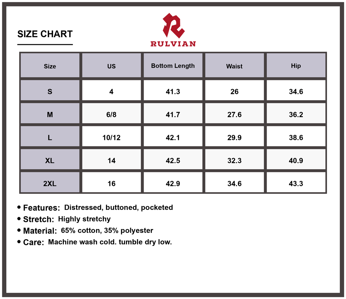 Size US Bottom Length Waist Hip