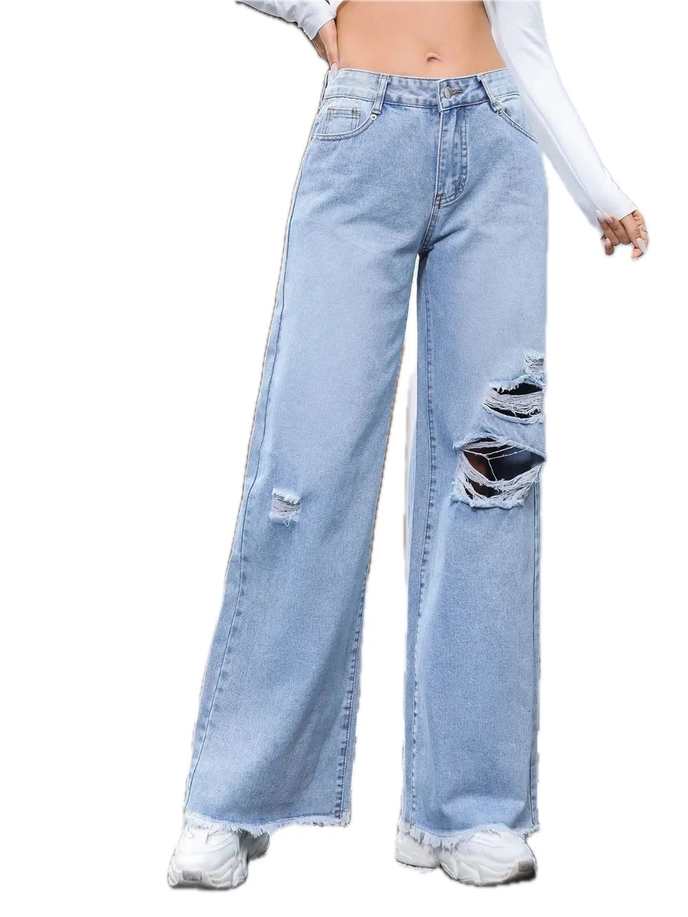 Womens Distressed Raw Hem Wide Leg Jeans Buttoned Front Pockets Casual Everyday Wear Durable Versatile Denim Bottoms
