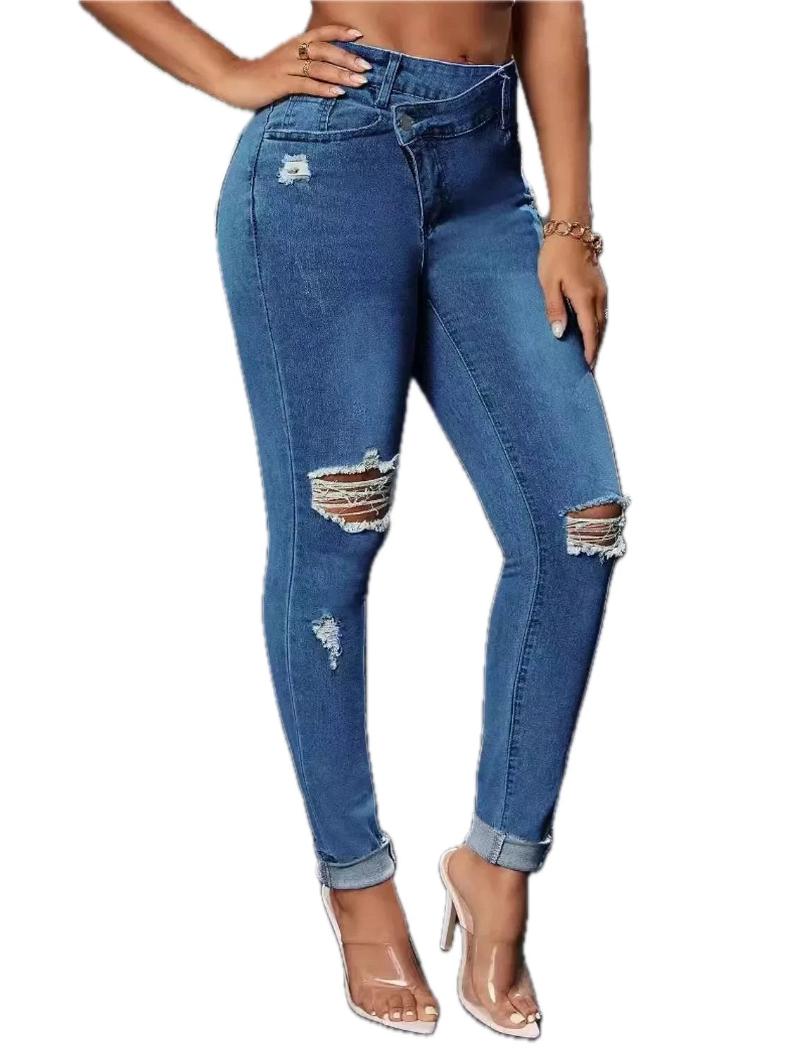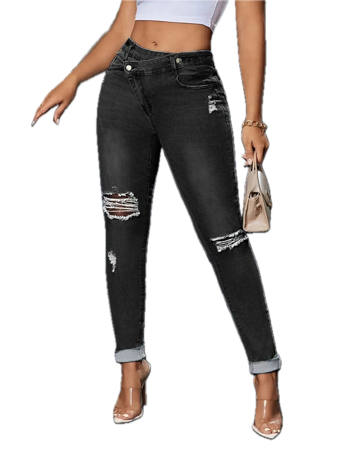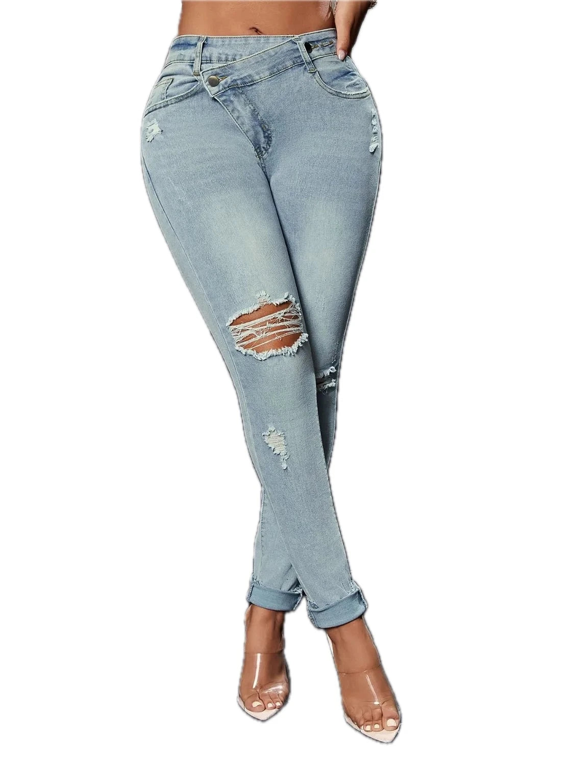 Womens Distressed Skinny Jeans with Pockets Buttoned Design Slightly Stretchy Slim Fit Casual Everyday Wear All Season