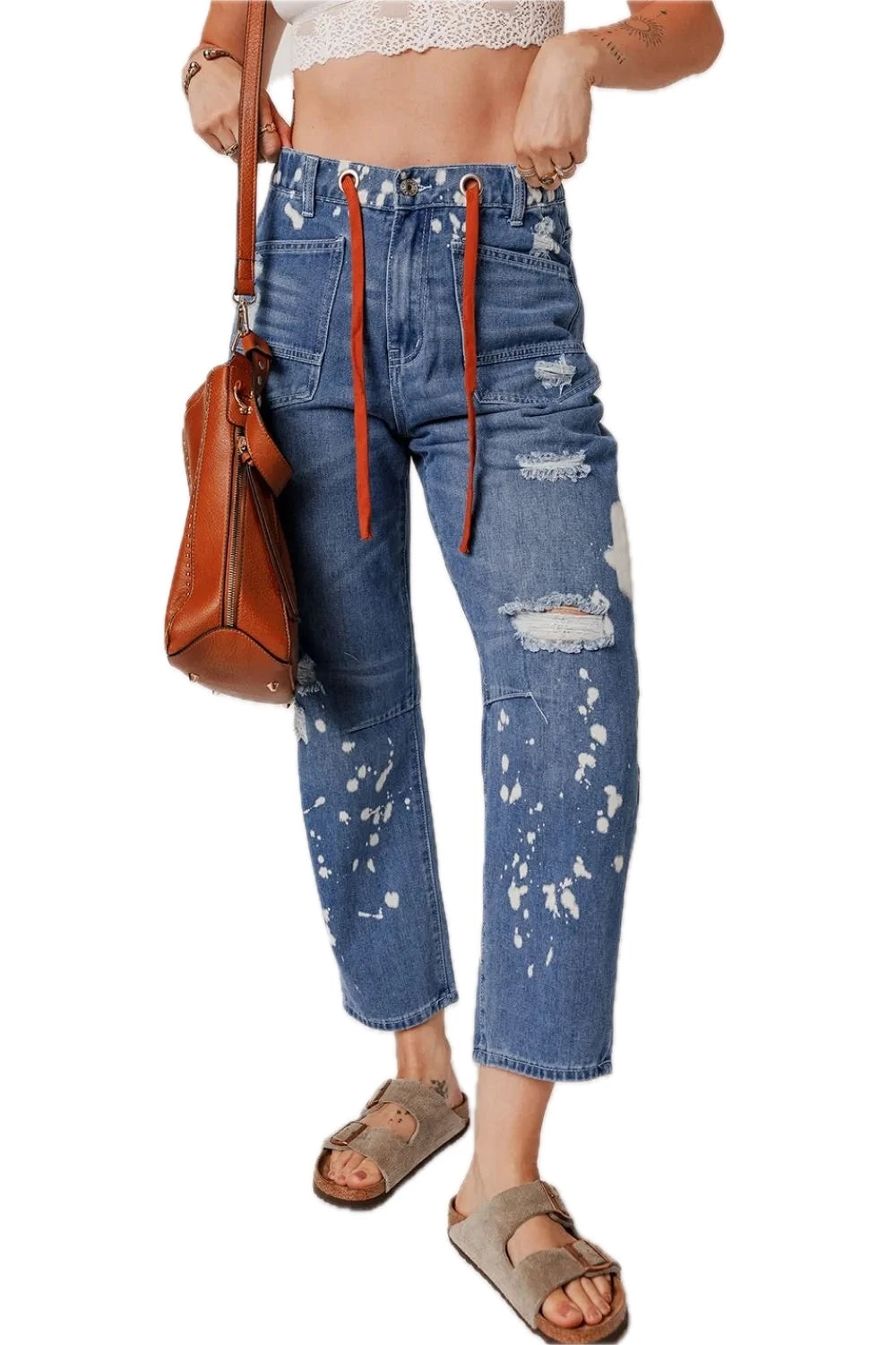 Womens Distressed Cropped Straight Leg Jeans With Paint Splatter And Drawstring Waist Pocketed For Everyday Denim