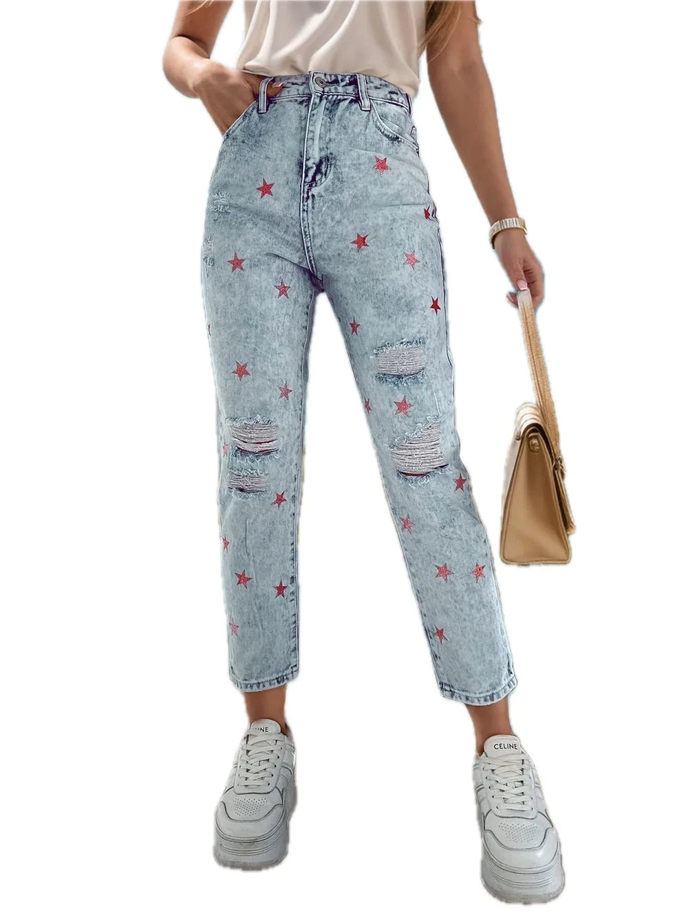 Womens Distressed Star Jeans with Pockets Denim Pants No Stretch Casual Everyday Wear Durable Cotton Polyester Fabric