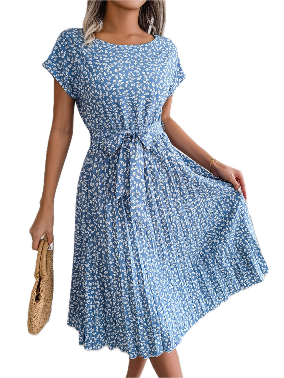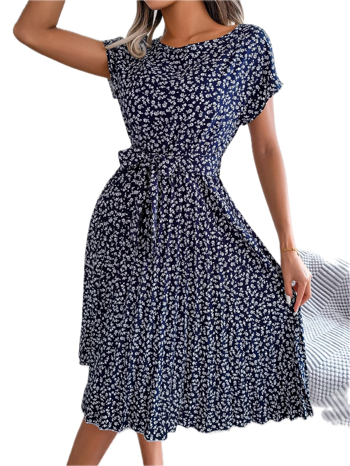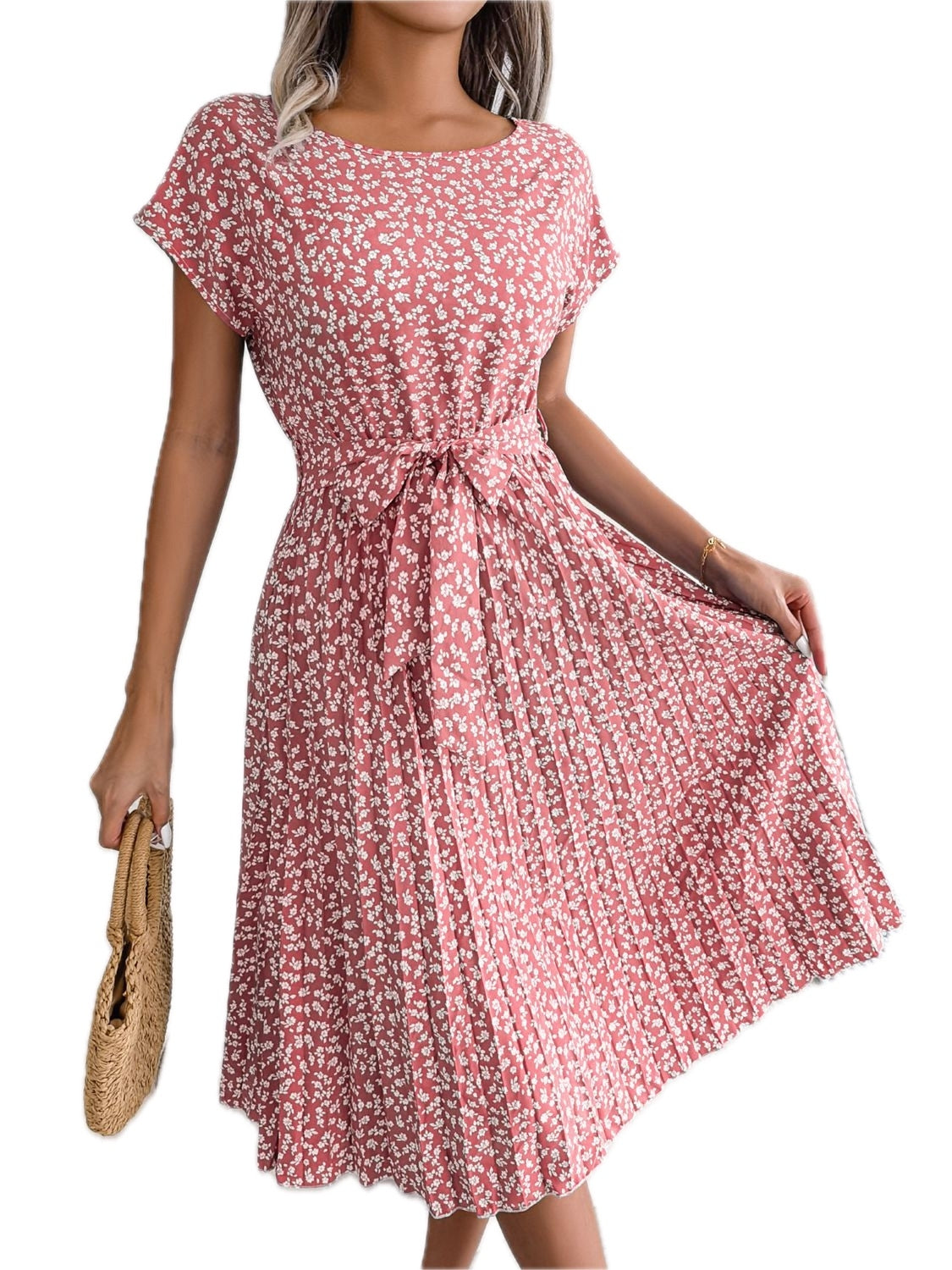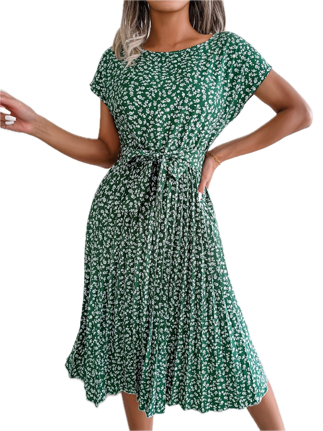 Women's Ditsy Floral Pleated Belted Midi Dress Round Neck Short Sleeves A Line Hem Casual Chic 60% Polyester Dress