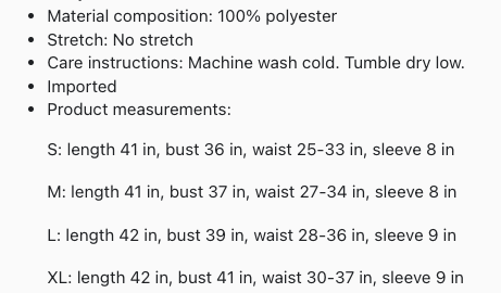 S: length 41 in, bust 36 in, waist 25-33 in, sleeve 8 in