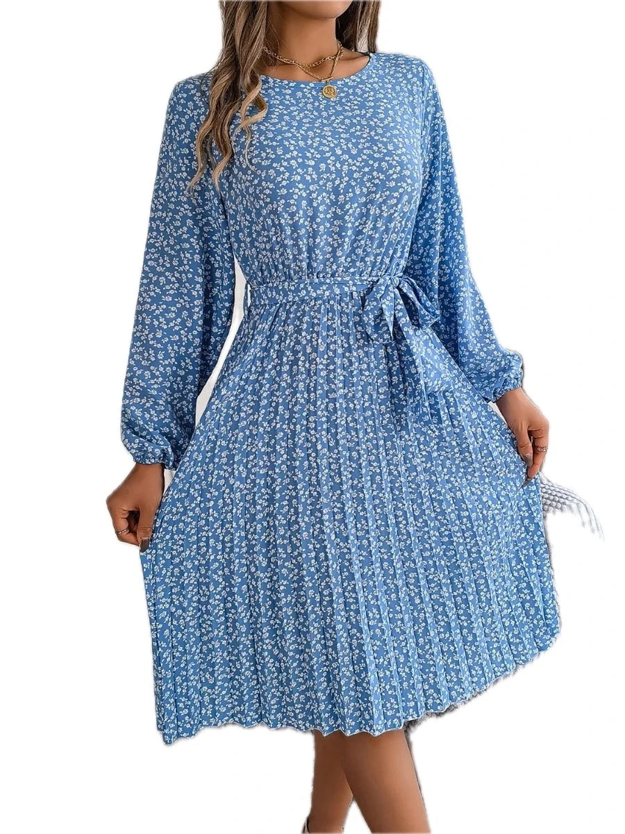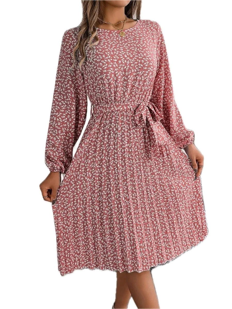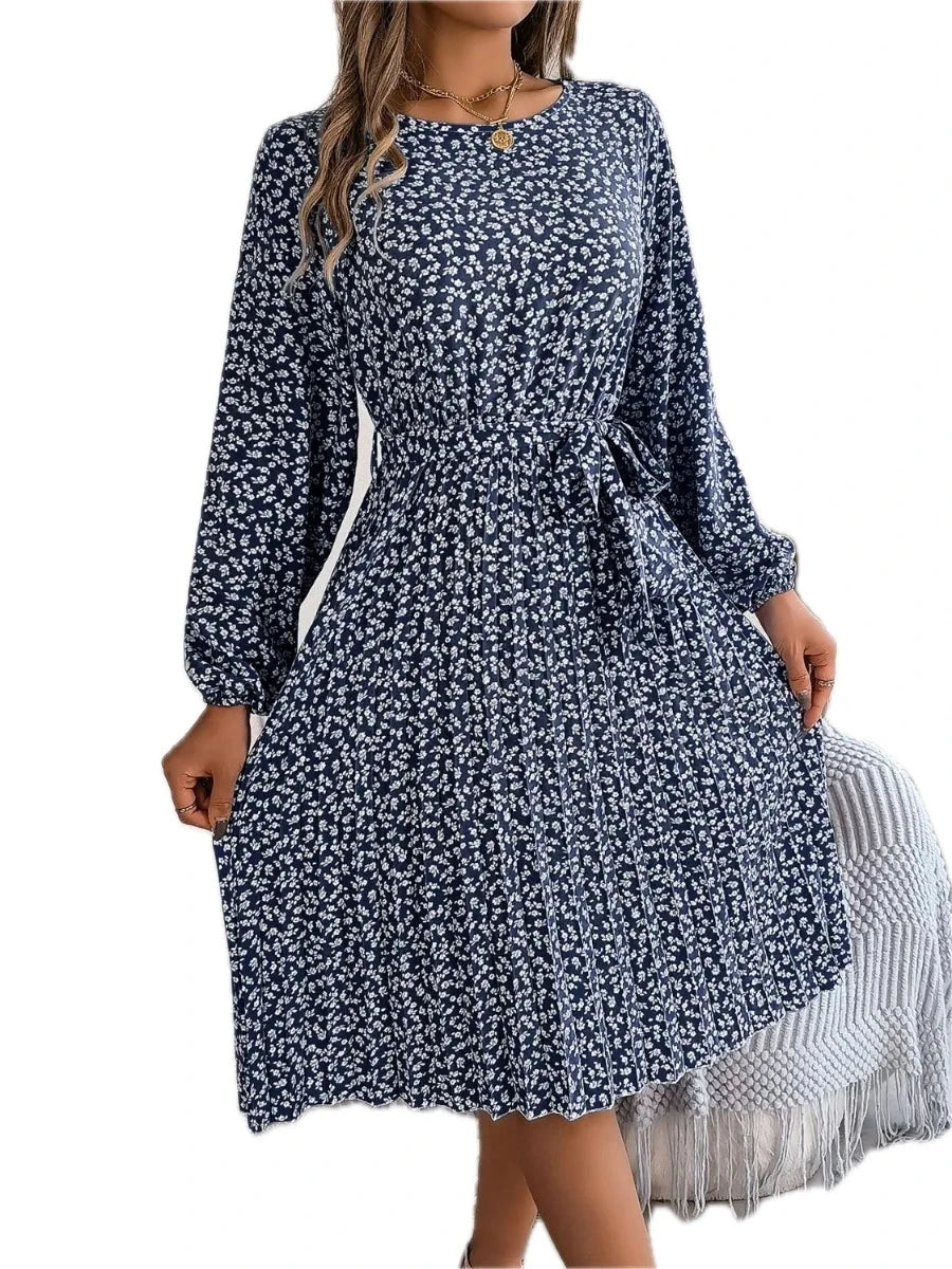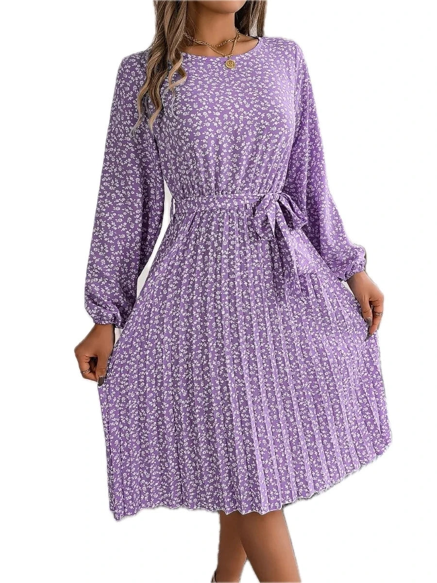 Women's Ditsy Floral Tie Waist Pleated Dress 100% Polyester Fabric Comfortable Lightweight Everyday Wear for Seasons