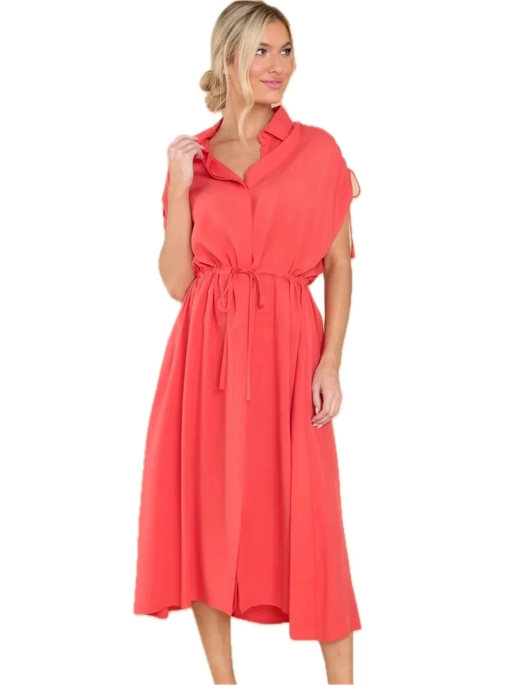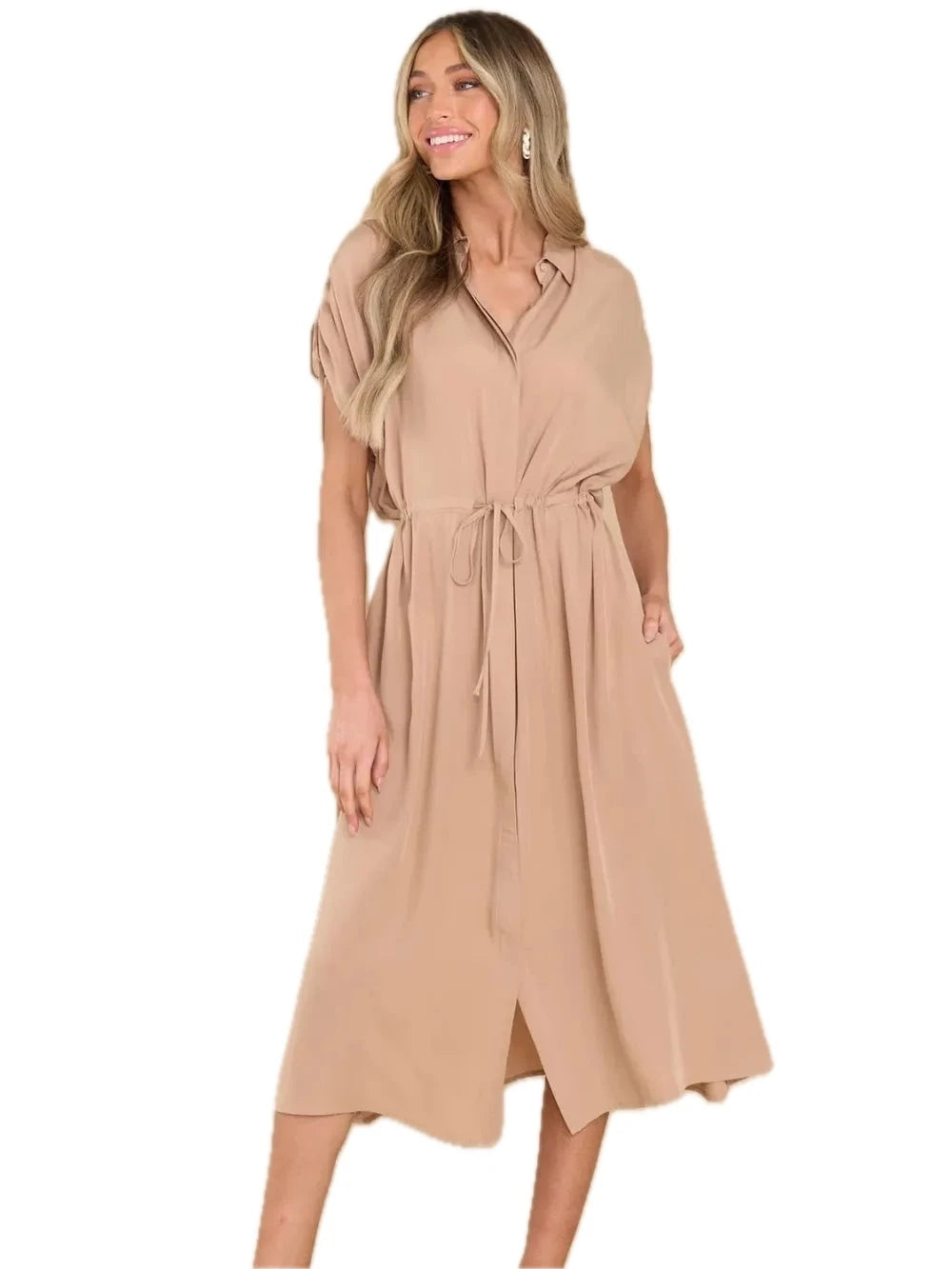 Women's Drawstring Collared Neck Short Sleeve Midi Dress with Buttoned Front and Sheer Detail in 100% Polyester