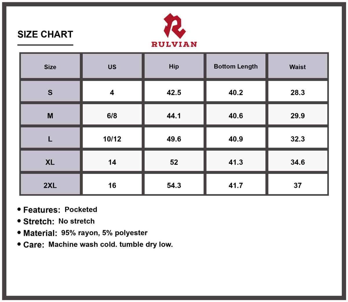 - Material composition: 95% rayon, 5% polyester