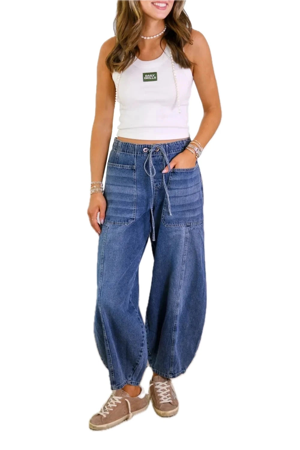 Women Drawstring Jeans with Pockets No Stretch Casual Everyday Relaxed Fit Durable Trousers Front and Back Pockets