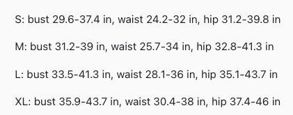 S: bust 29.6-37.4 in, waist 24.2-32 in, hip 31.2-39.8 in
