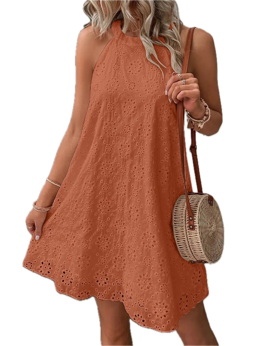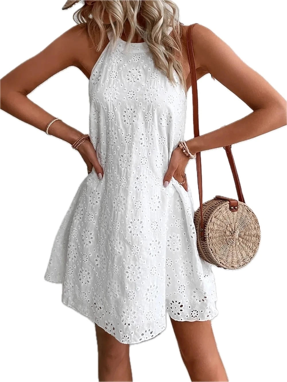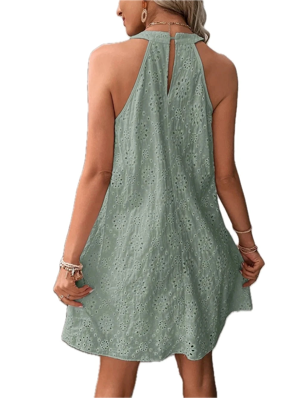 Women's Eyelet Grecian Neck Mini Dress with Sheer Bodice Polyester Fabric Dress for Elegant Summer Party Look