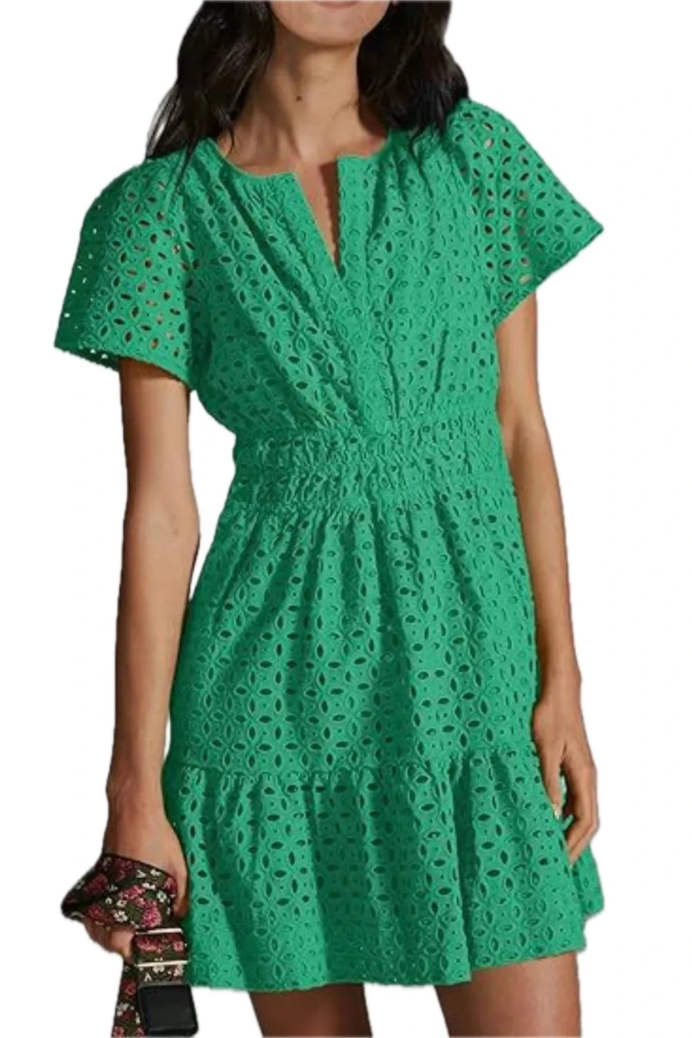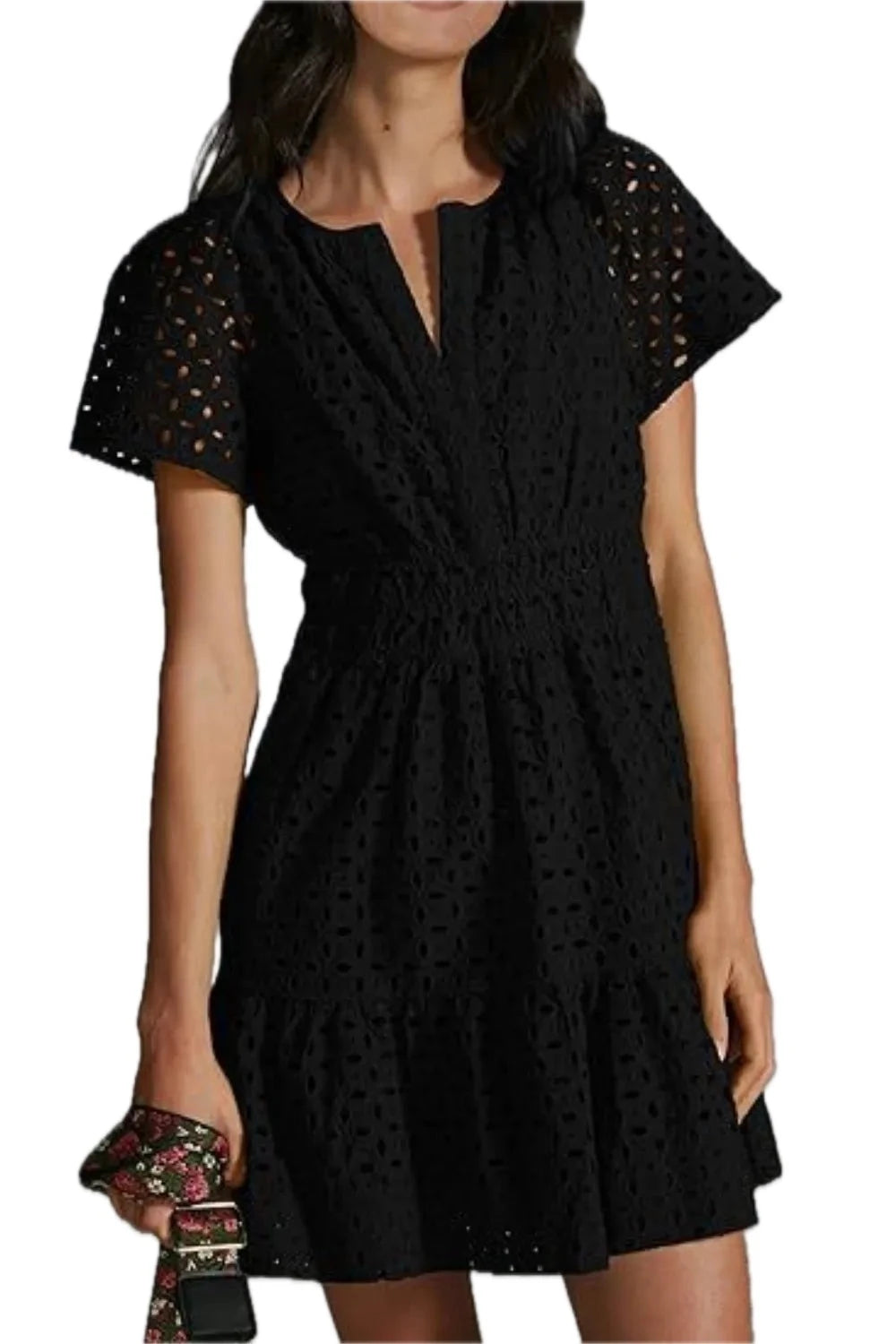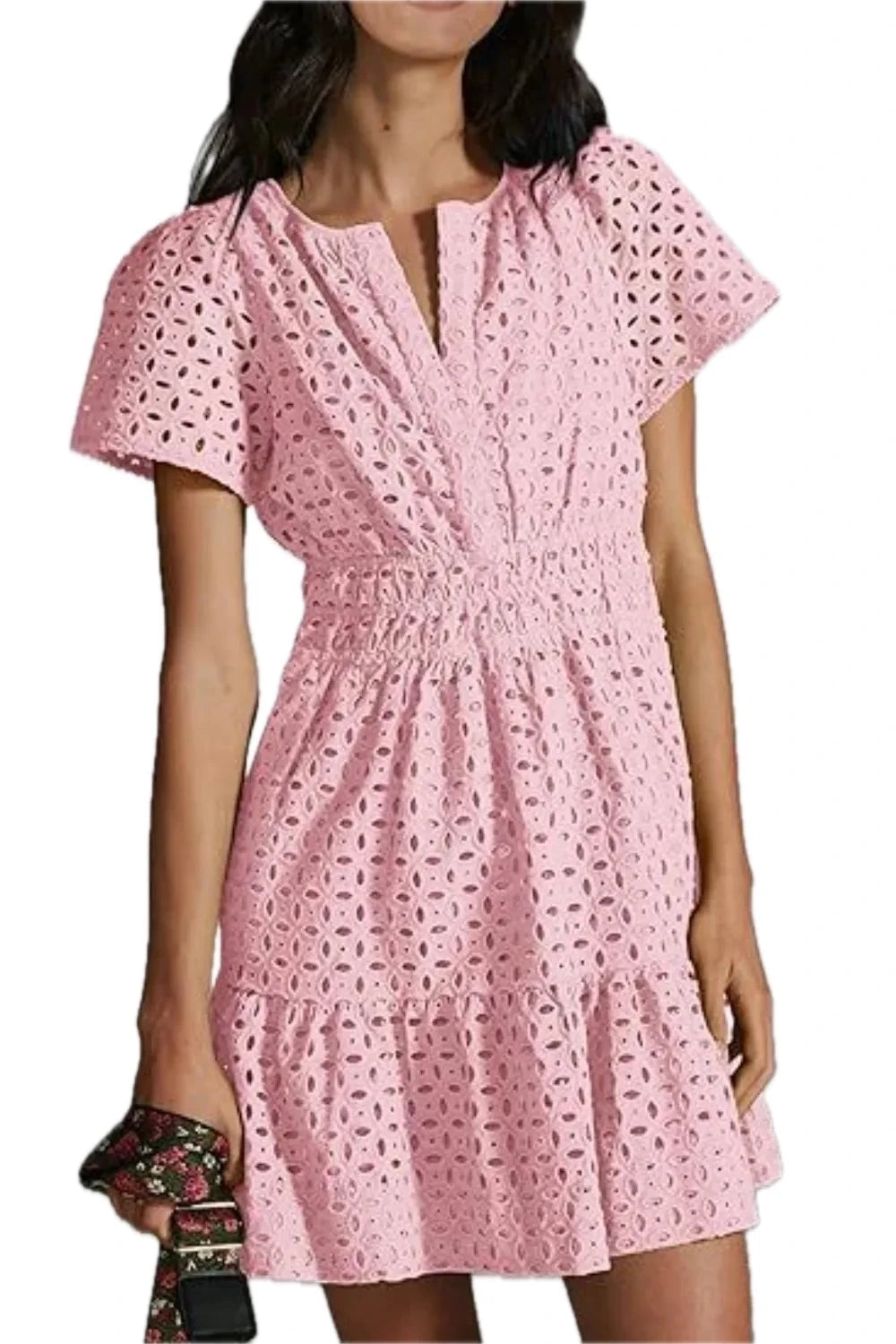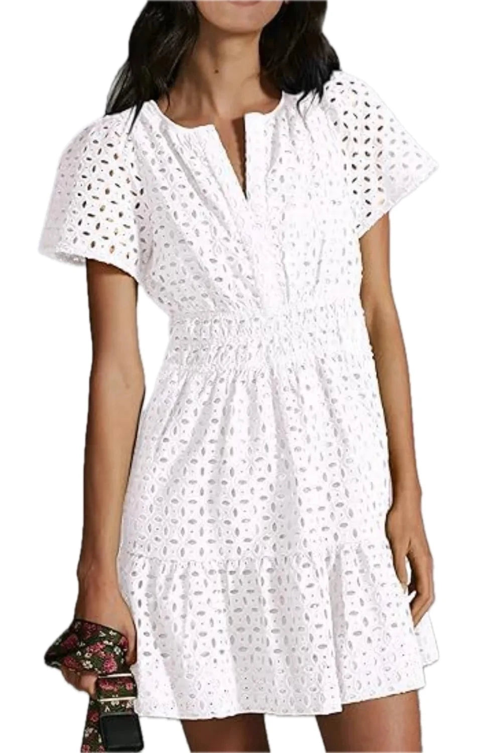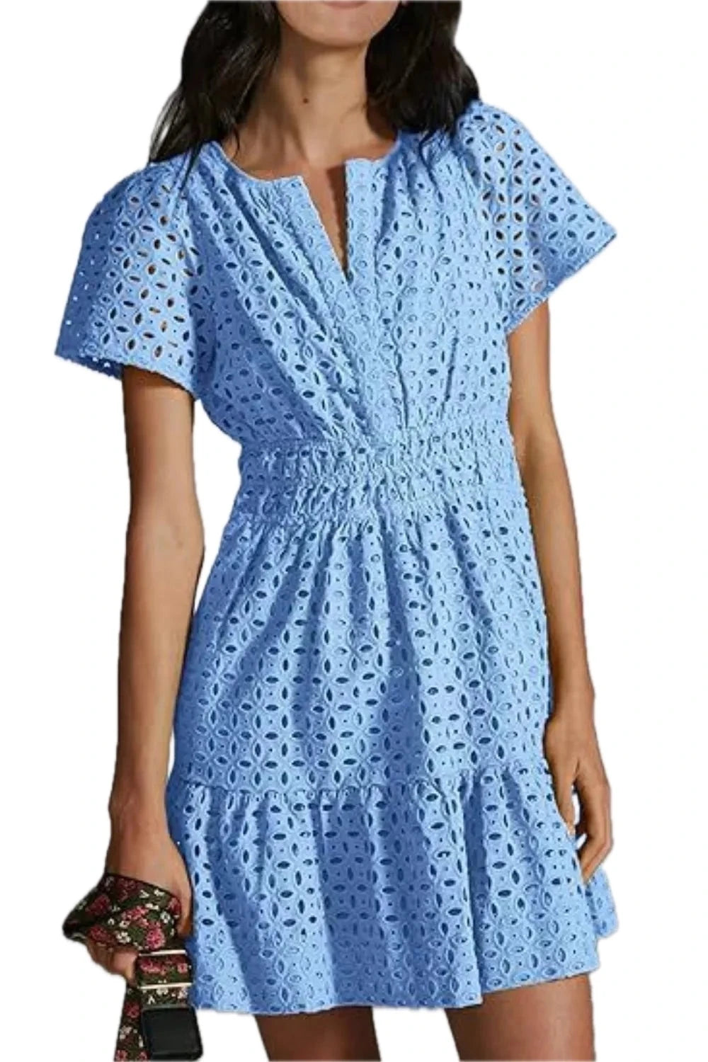 Womens Eyelet Notched Short Sleeve Mini Dress with Semi Sheer Body Not Lined 100% Polyester Easy Care Machine Wash