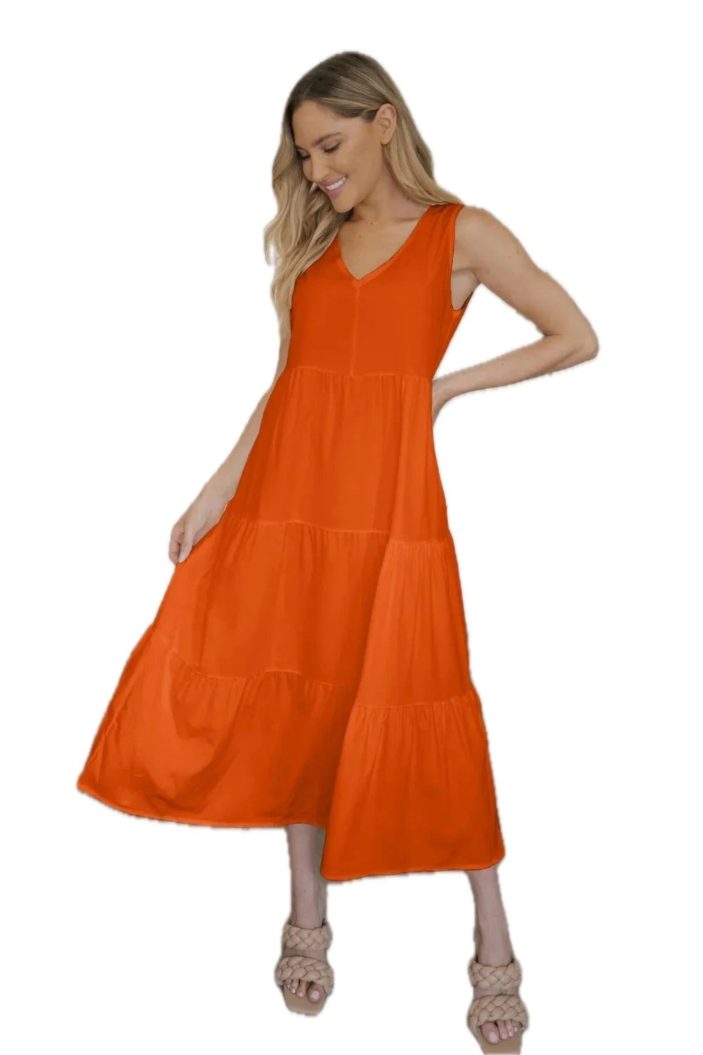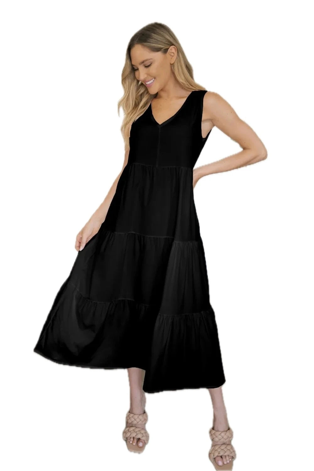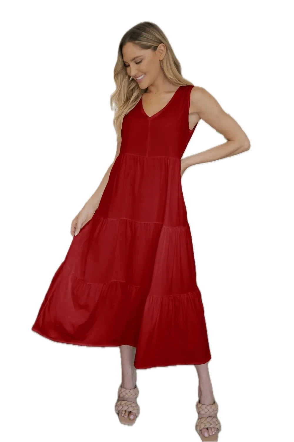 Women's Tiered V neck Sleeveless Dress with Soft Draping Stretch 95% Polyester 5% Spandex Easy Care Silhouette