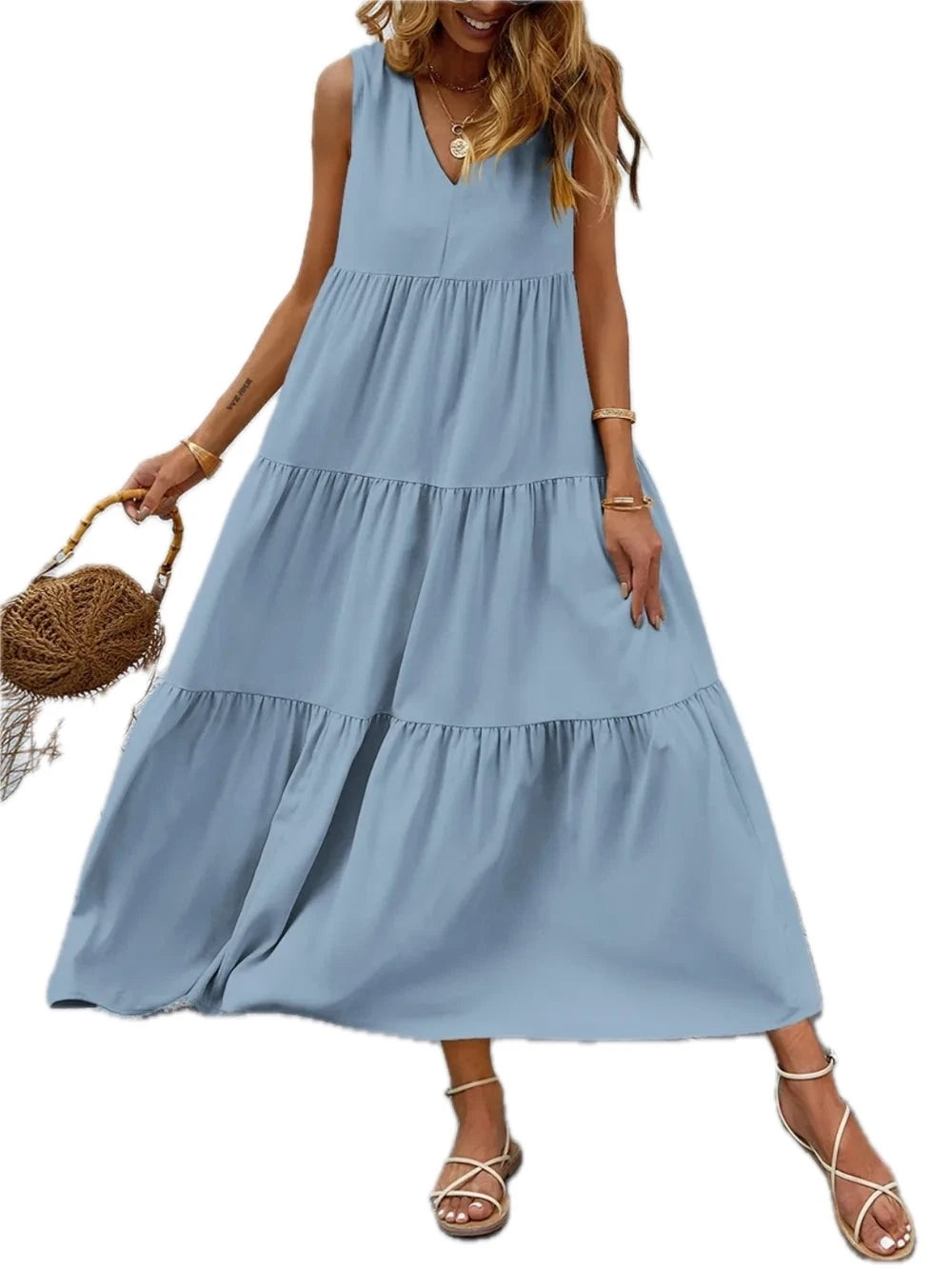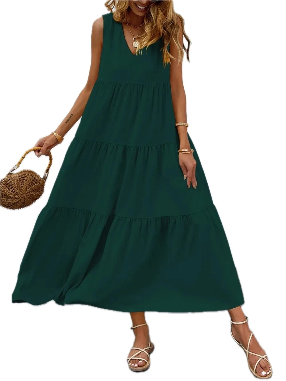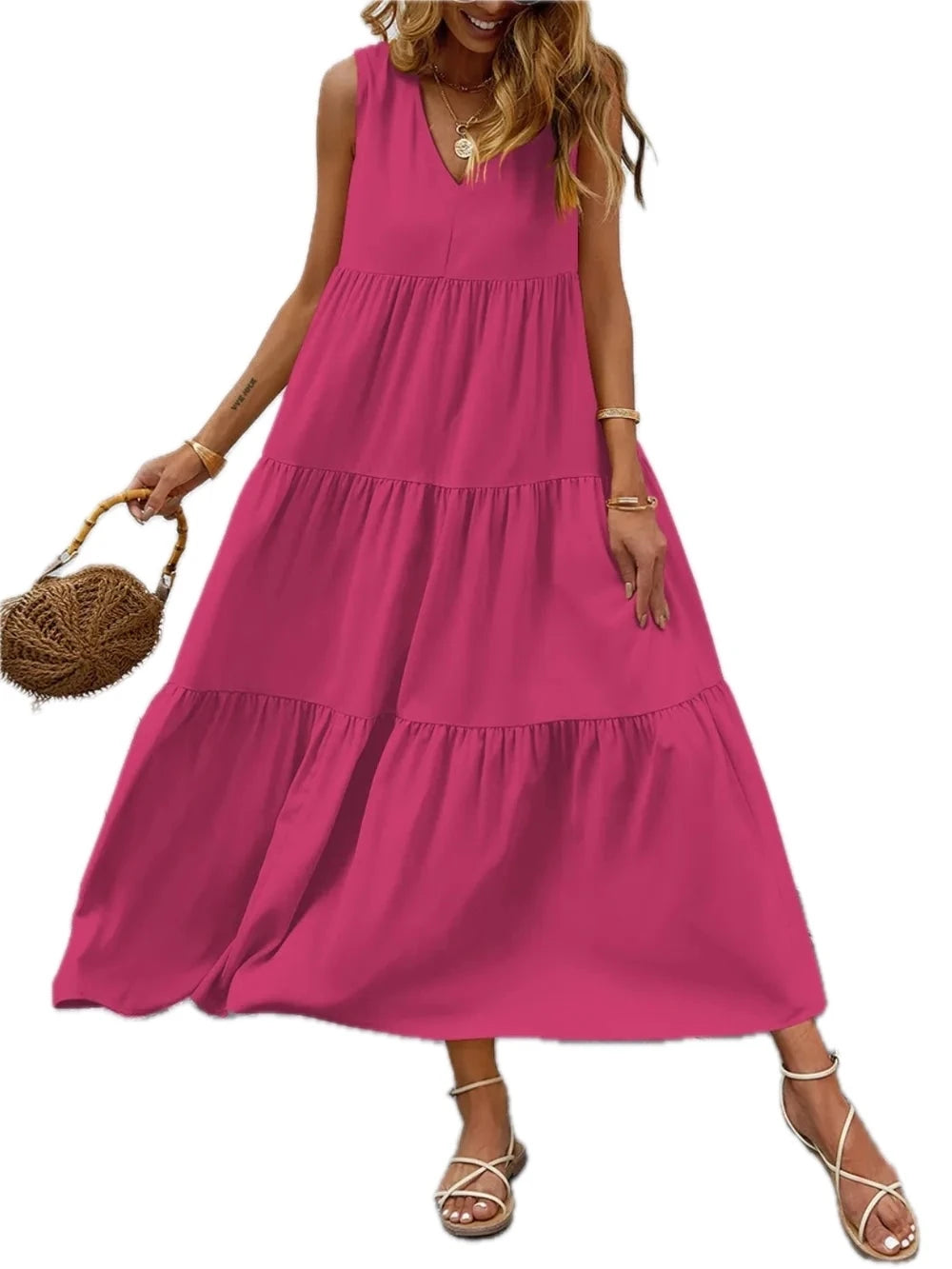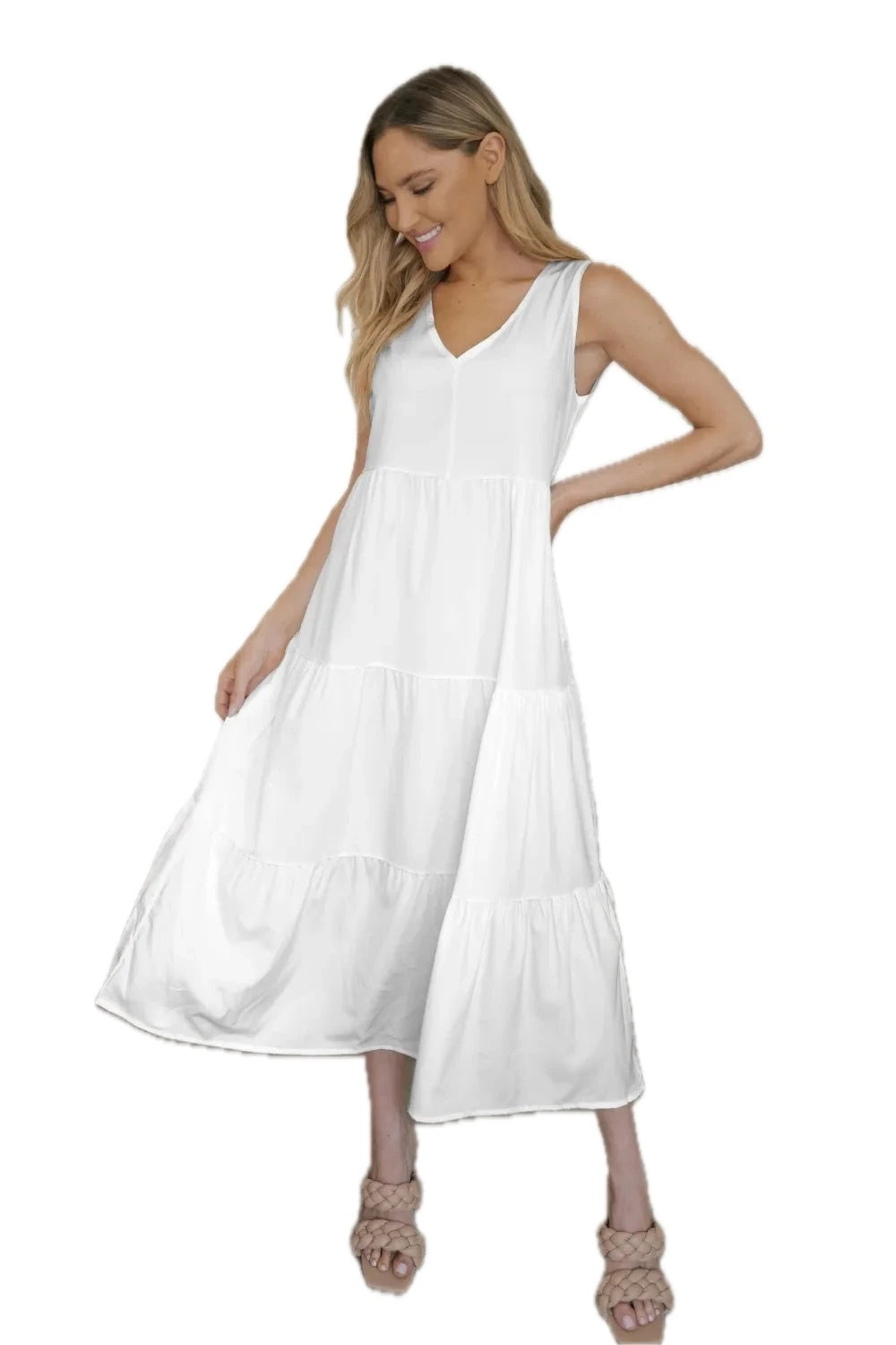 Women's Tiered V neck Sleeveless Dress with Soft Draping Stretch 95% Polyester 5% Spandex Easy Care Silhouette