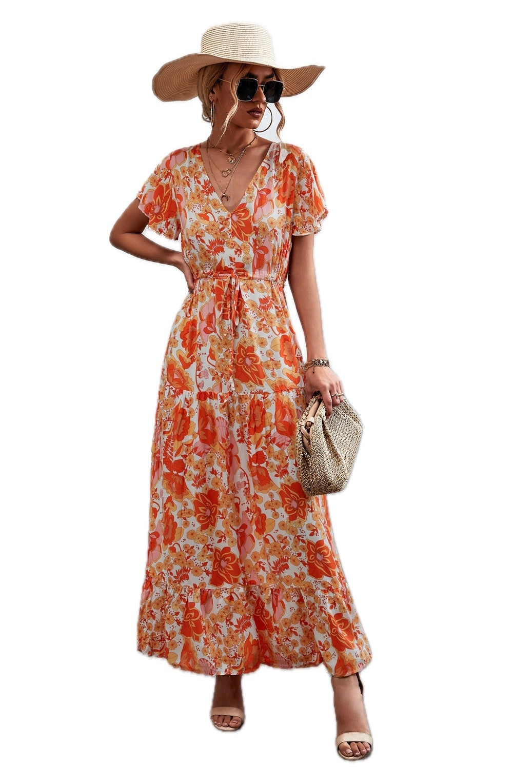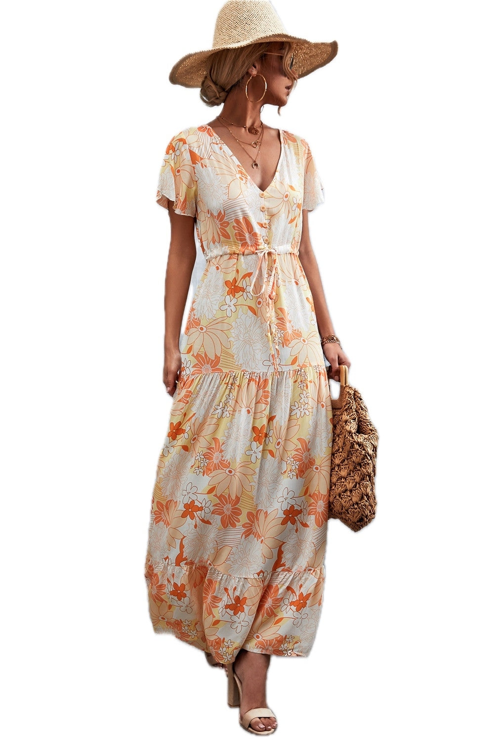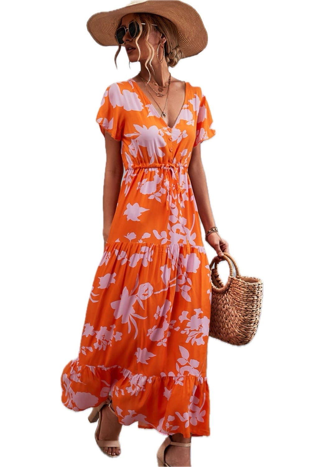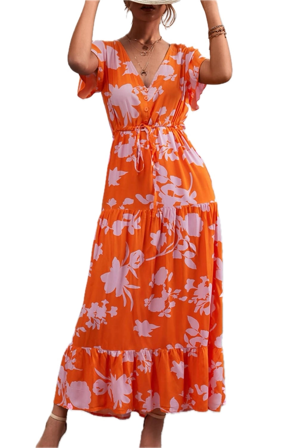 Women's Floral Buttoned Drawstring Waist Tiered Dress with V neck Midi Flutter Sleeves 95% Polyester 5% Spandex