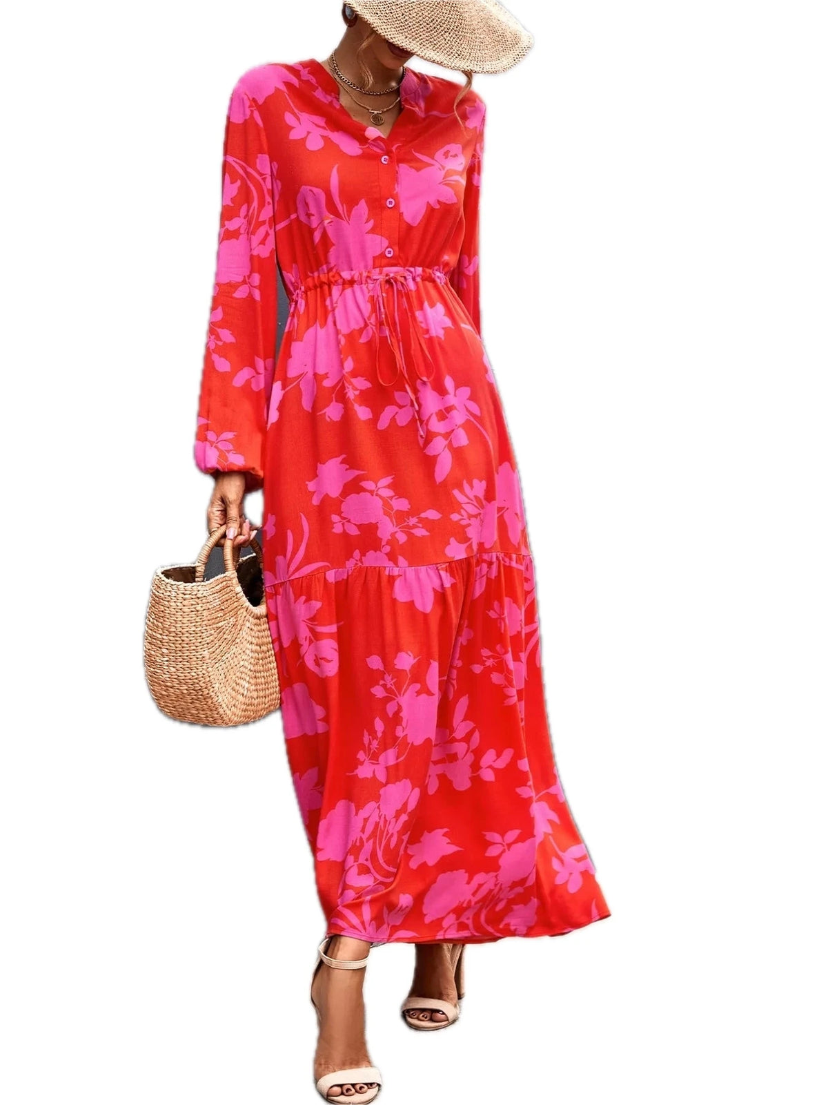 Women's Floral Drawstring Waist Long Sleeve Maxi Dress with 95% polyester and 5% spandex fabric featuring a flowy style