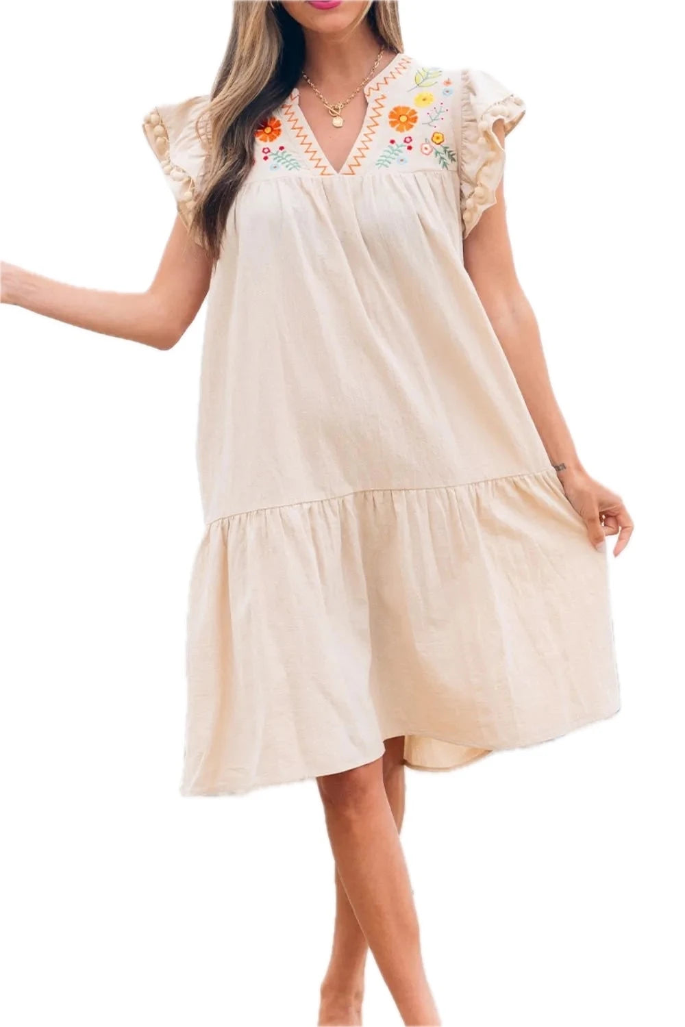 Women's Floral Embroidered Pom Pom Ruffle Sleeves Mini Dress 100% Cotton Lightweight Summer Dress Casual Vacation Look