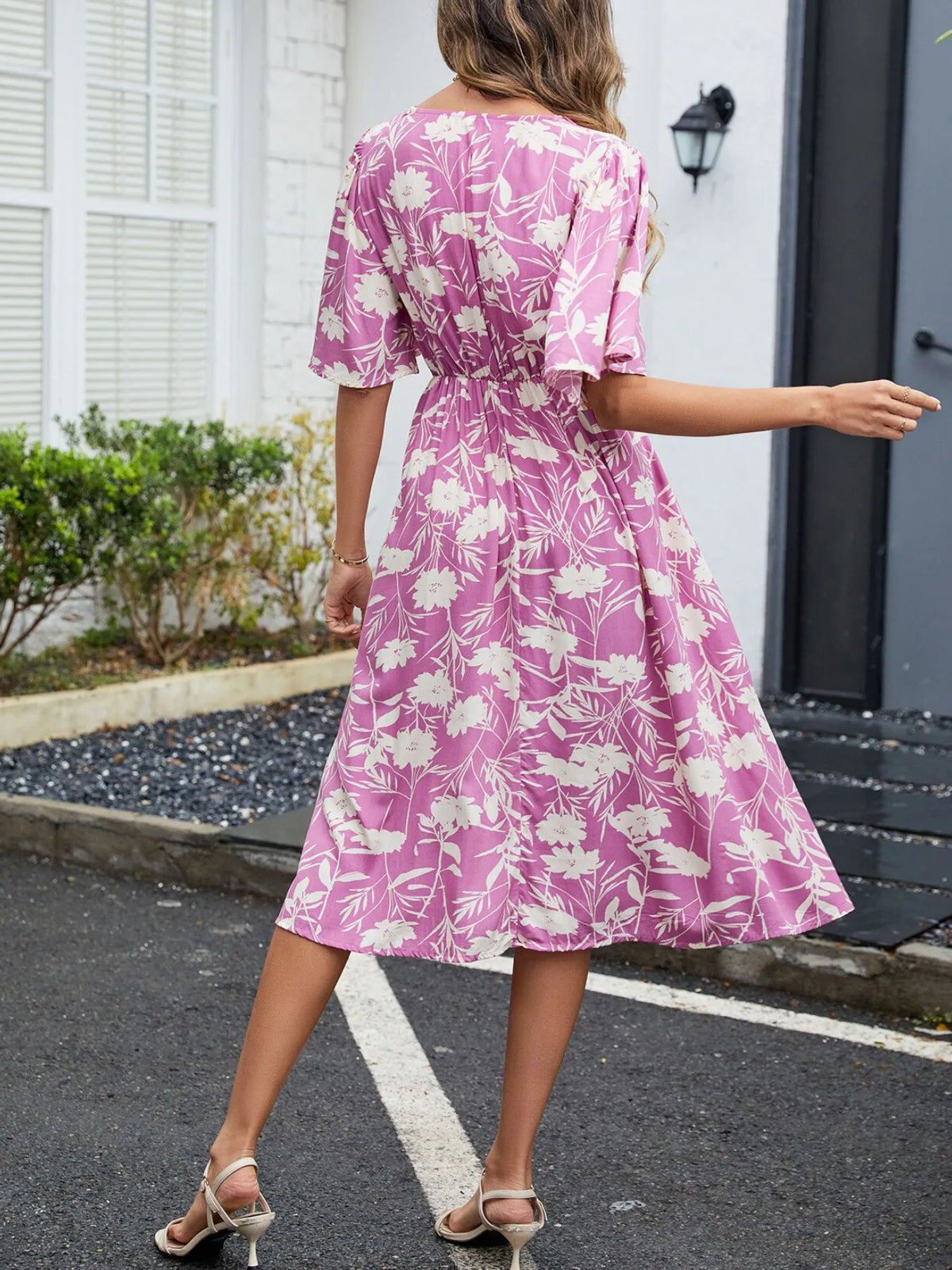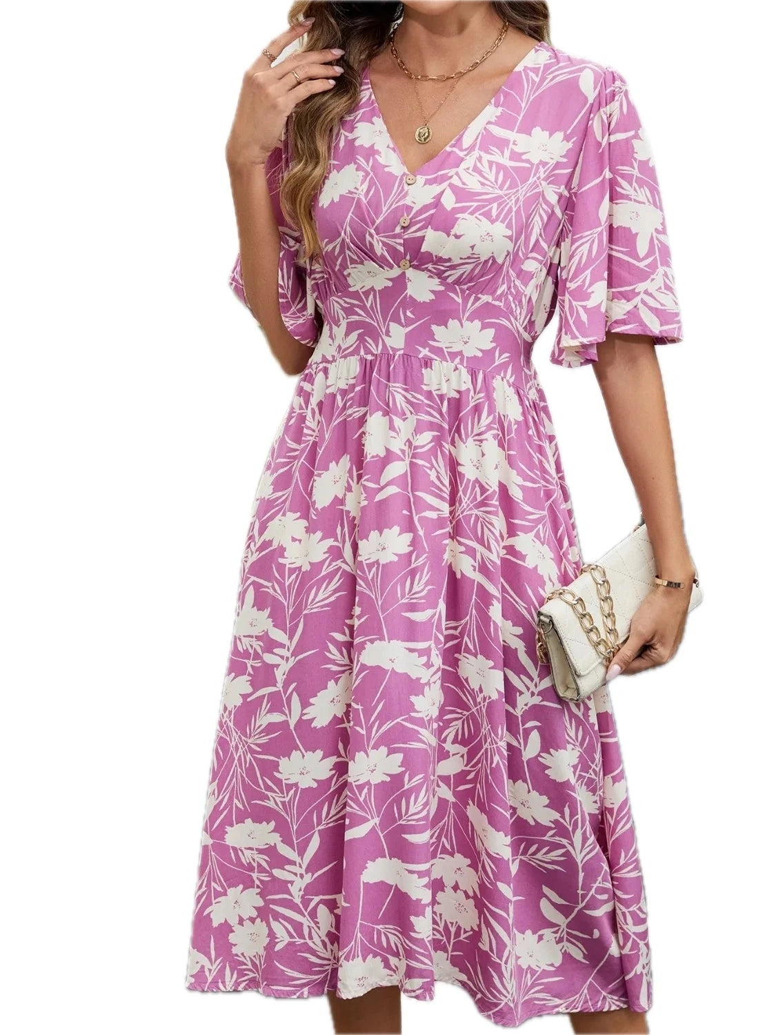 Women's Floral Flutter Sleeve V Neck Summer Midi Dress with Decorative Button and Ruched Bodice in 100% Polyester