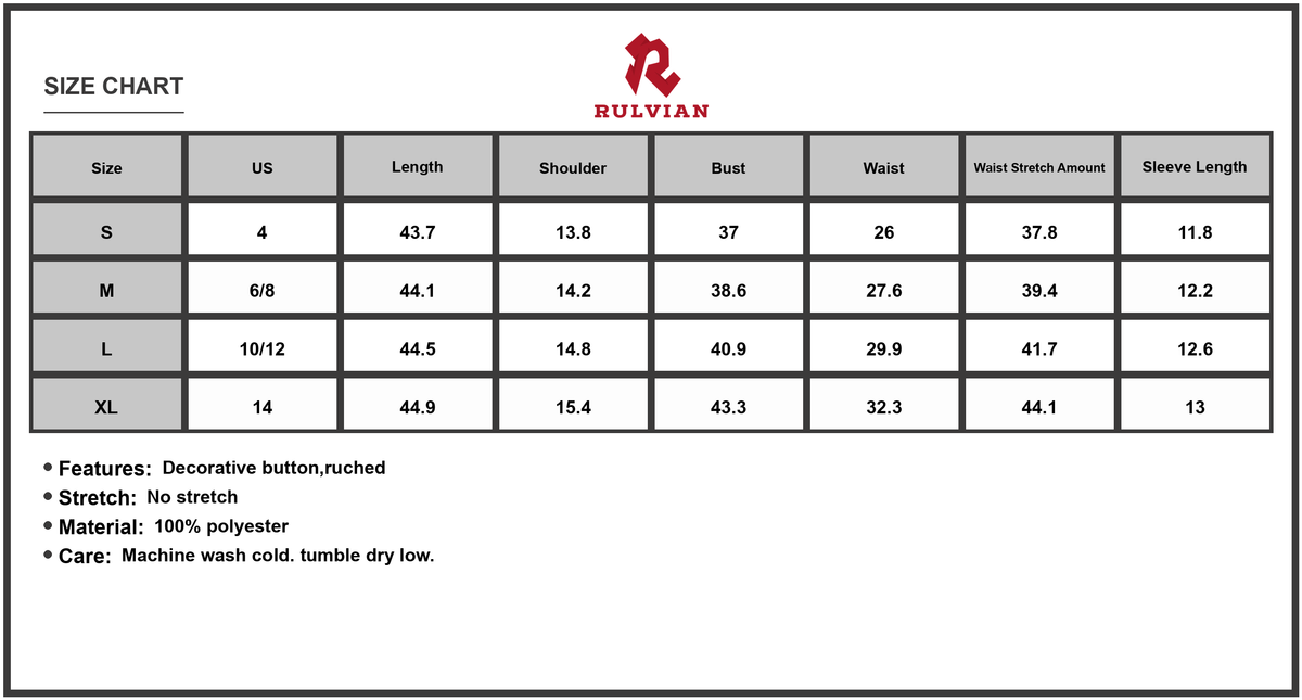 Size | US | Length | Shoulder | Bust | Waist | Waist Stretch Amount | Sleeve Length |