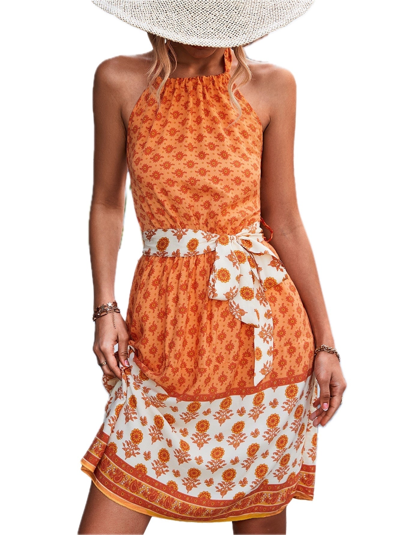 Womens Floral Halter Neck Dress Tie Waist Knee Sleeveless A Line Ninety Five Percent Polyester Five Percent Spandex