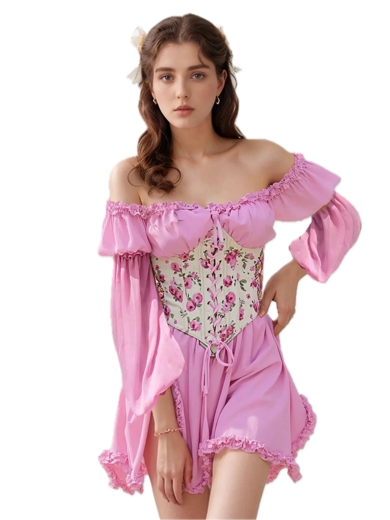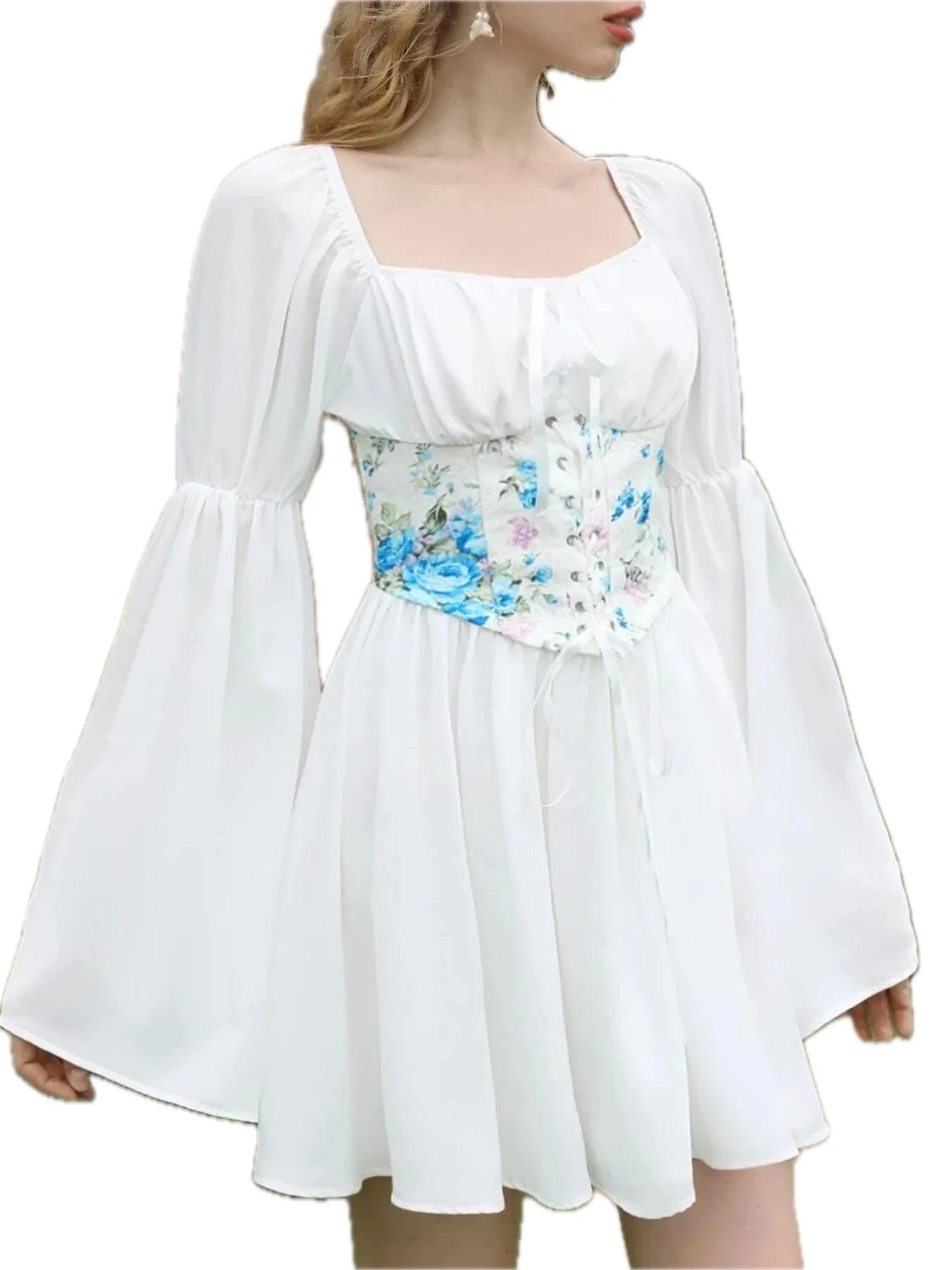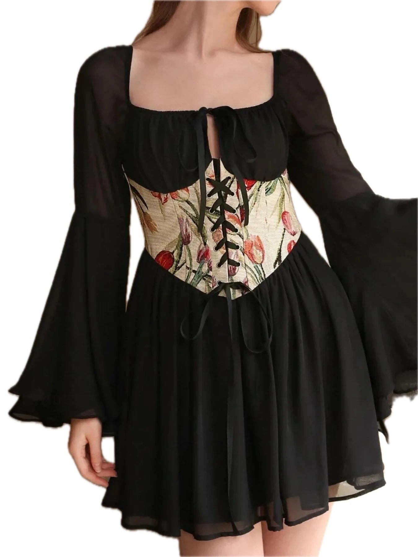 Women's Floral Lace Up Long Sleeve Mini Dress featuring eighty percent polyester and twenty percent cotton fabric