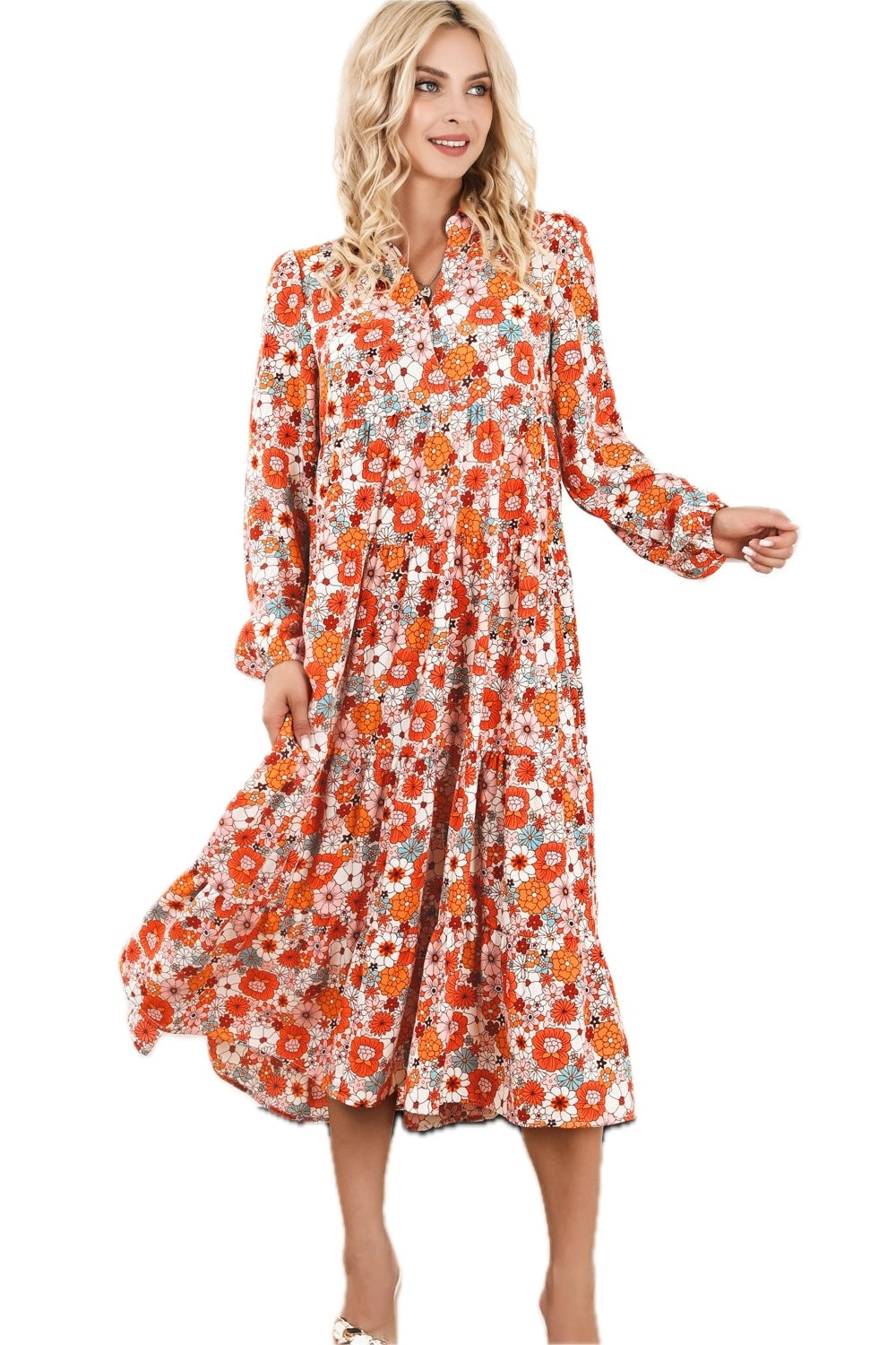 Women's Floral Notched Neck Long Sleeve Dress 100% Polyester Ruffled Sheer Details Not Lined Measurements Included By Size Chart