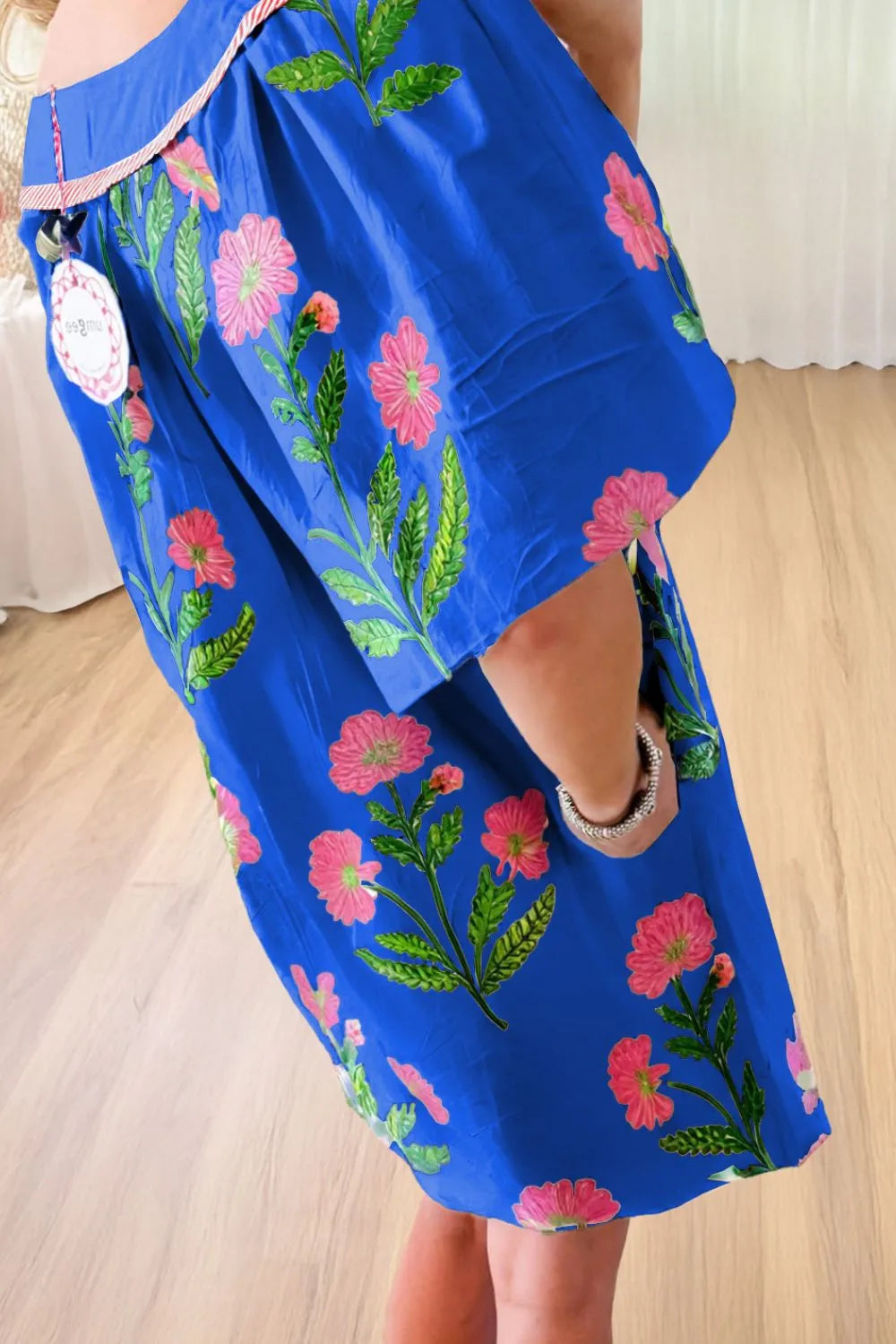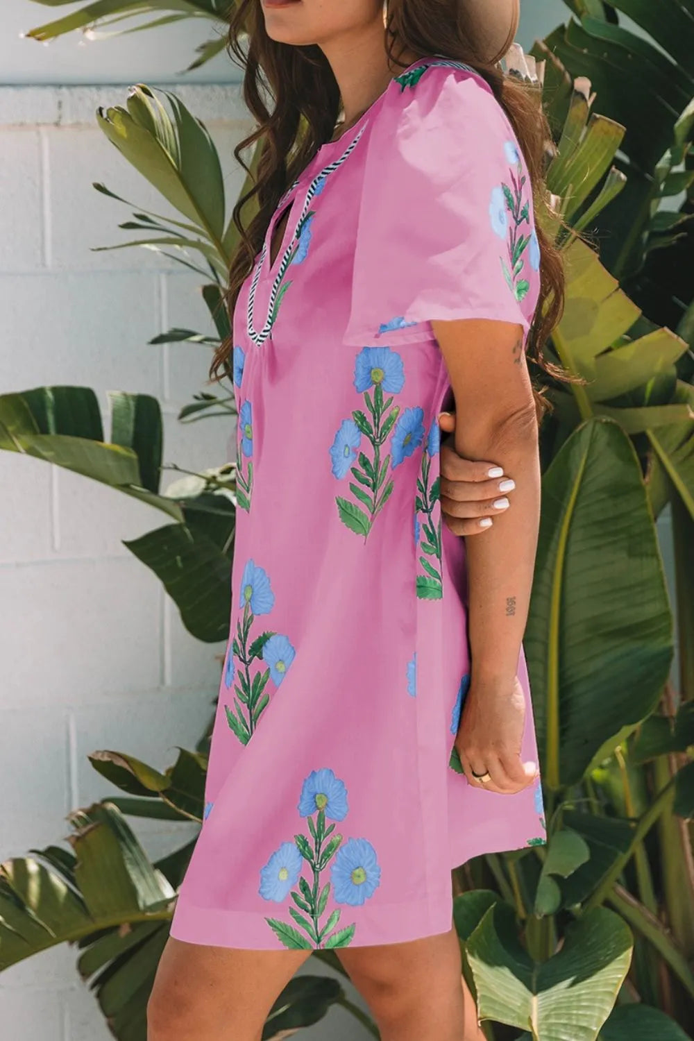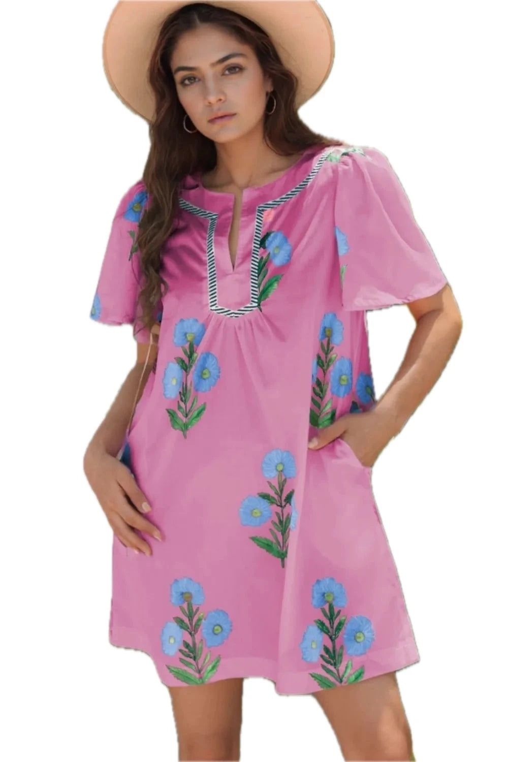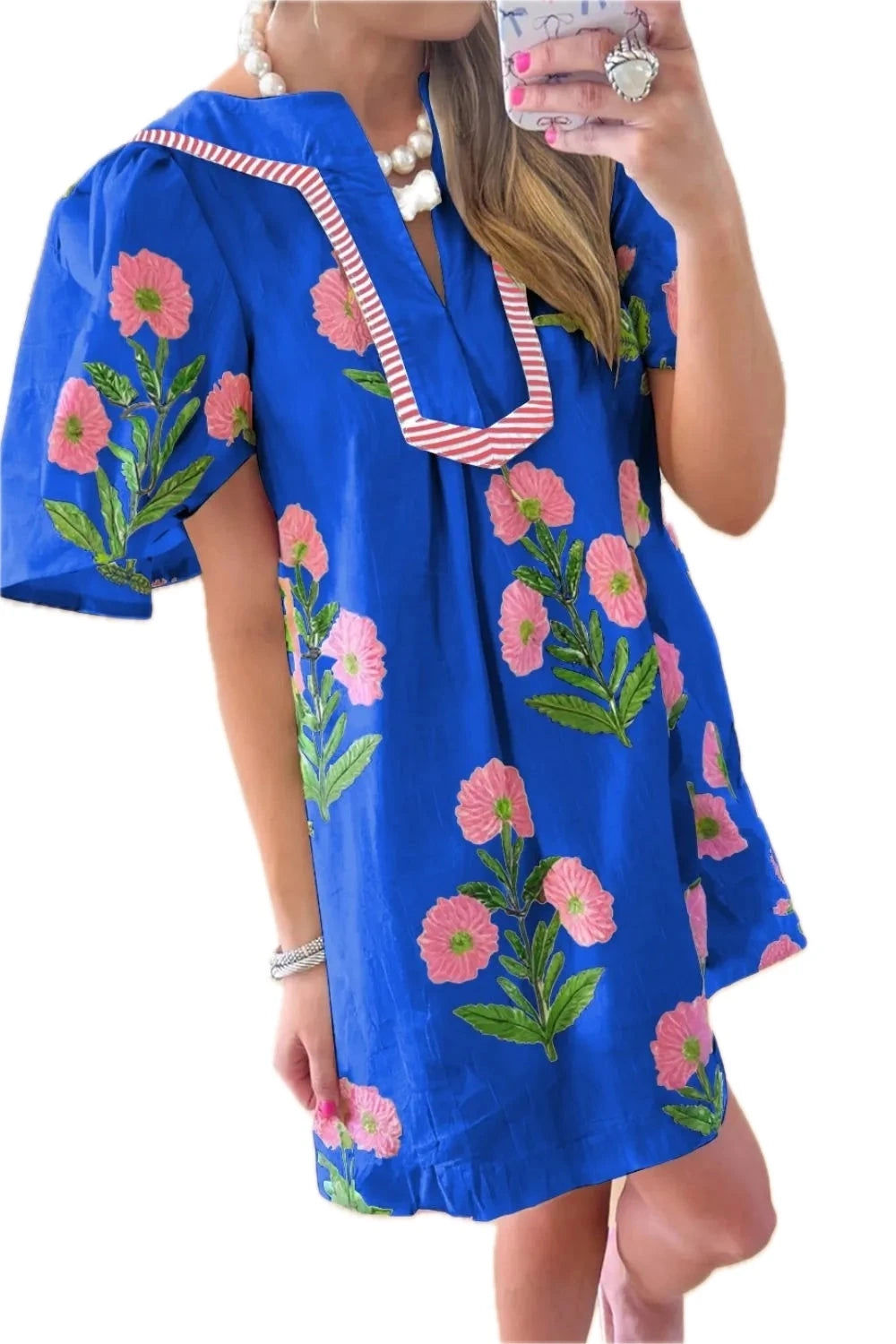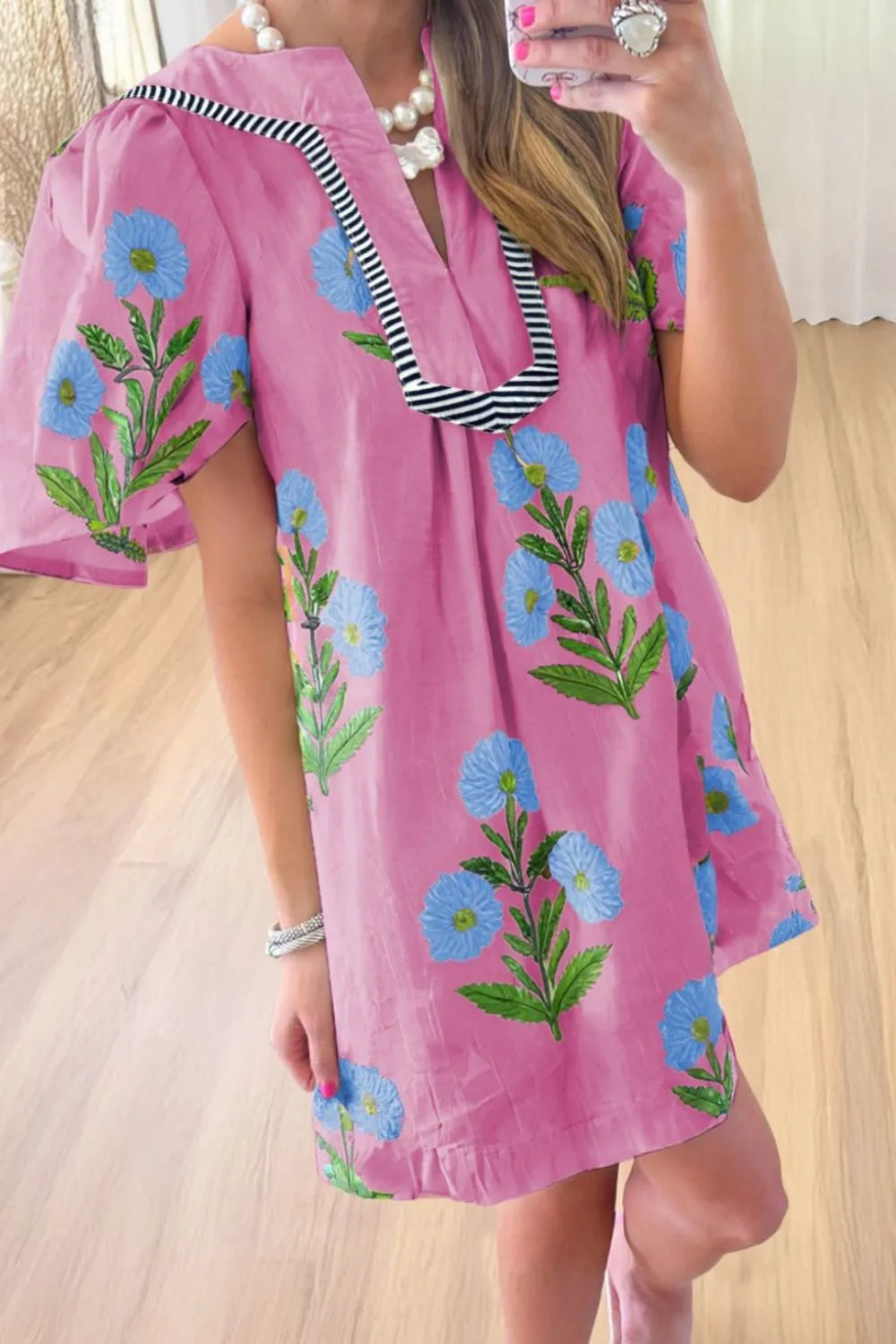 Women's Floral Notched Summer Mini Dress with Striped Trim Polyester % Fabric Lightweight Easy Care for Daytime Style