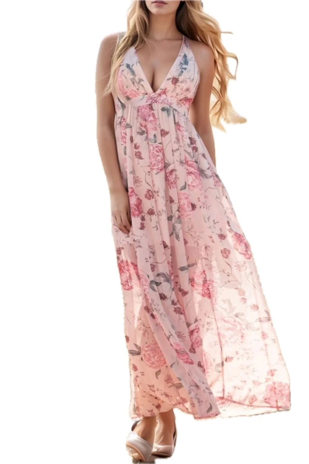 Women's Floral Pleated Deep V Backless Maxi Dress with Elegant Layers and Polyester % Fabric for Summer Parties