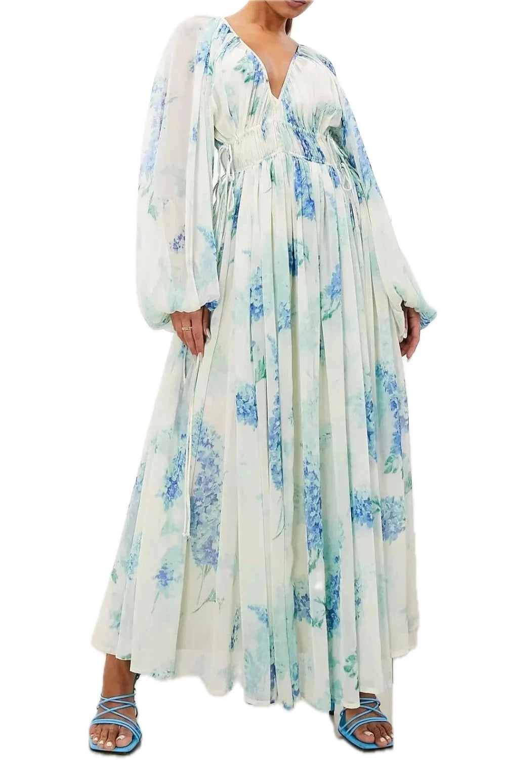 Women's Floral Bohemian Maxi Dress with Balloon Sleeves Tiered Smocked Drawstring 75% Polyester 25% Chiffon Elegant