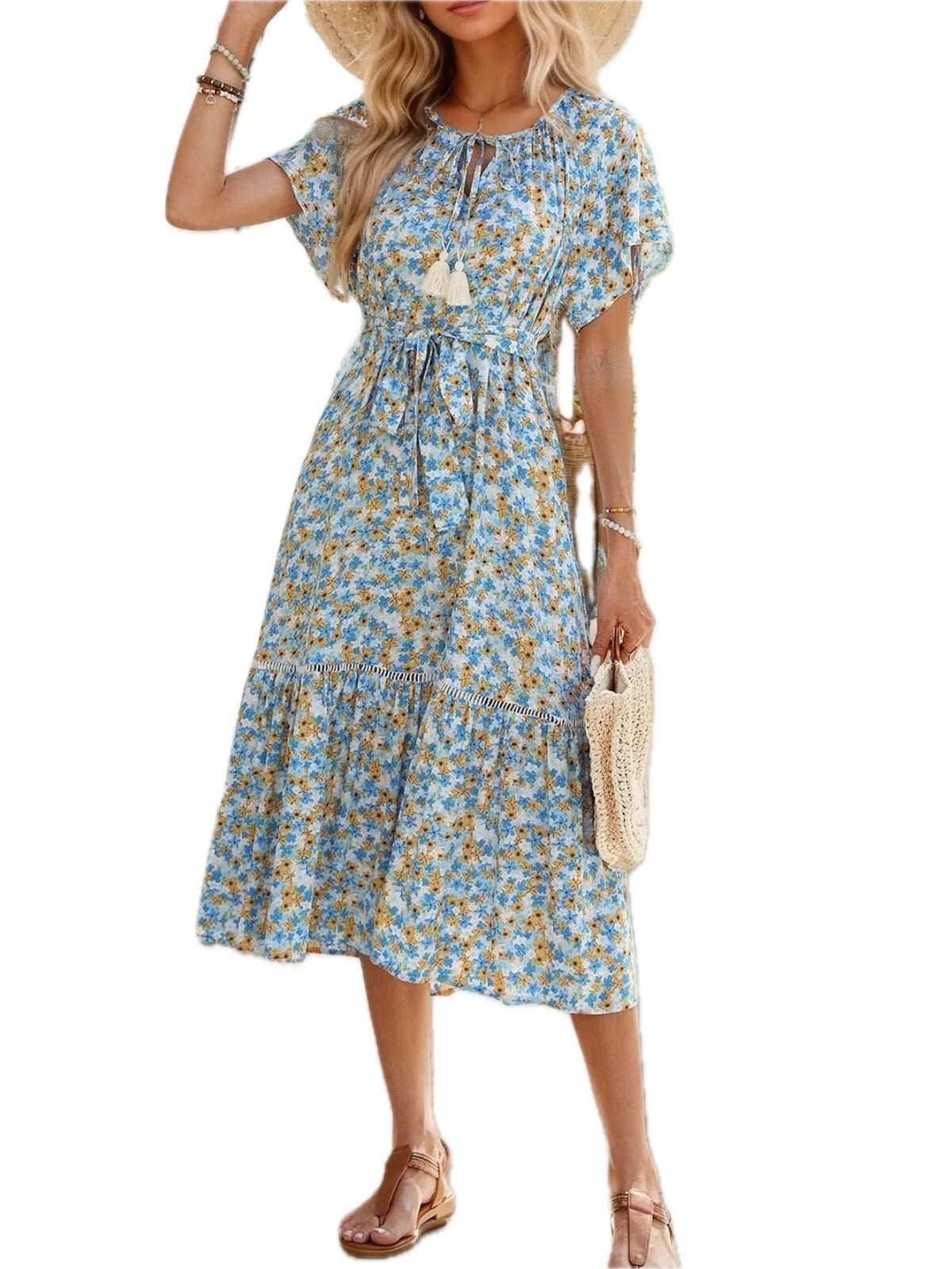 Women's Floral Print Midi Dress with Tie Front Ruched Bodice 100% Cotton Breathable Everyday Comfort for Warm Days