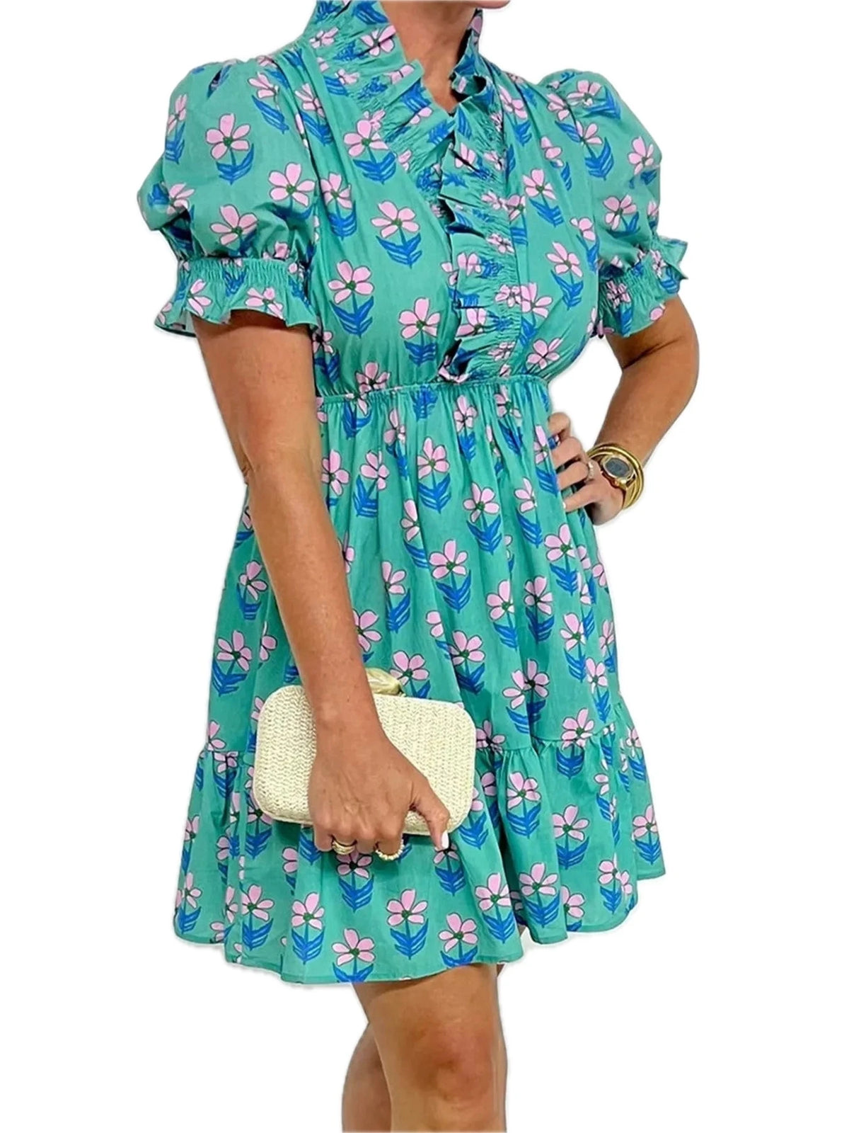 Women's Floral Print Puff Sleeve Shirt Dress with Frill Detail 70% Polyester Fabric for Everyday Wear Lightweight