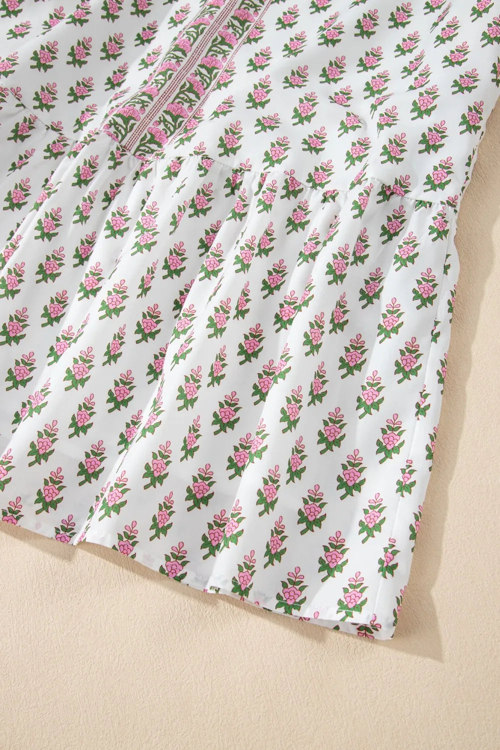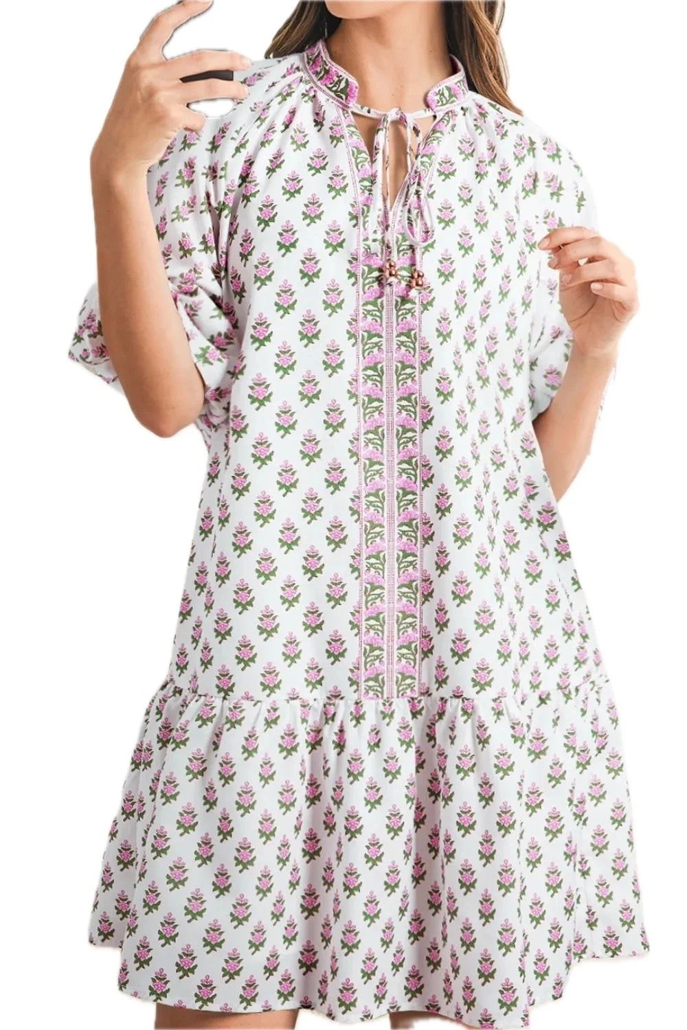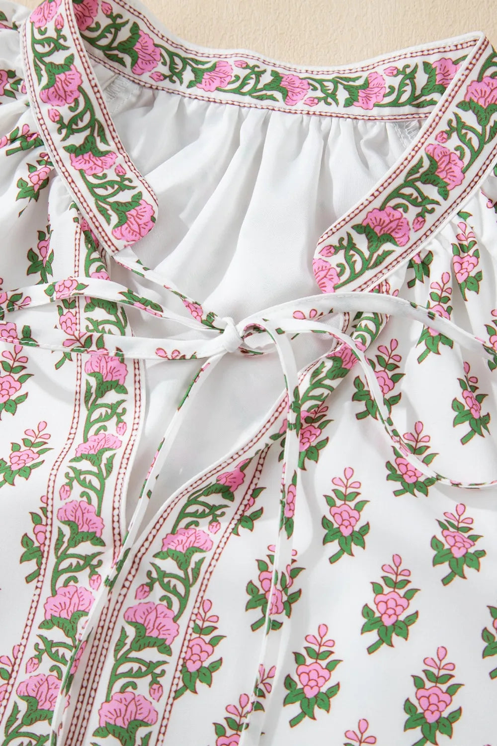 Women's Floral Print Puff Sleeve Tie Neck Dress with Ruffled Hem 100% Polyester Easy Care Fabric for Everyday Wear