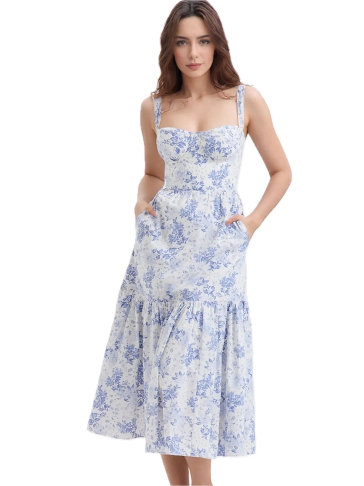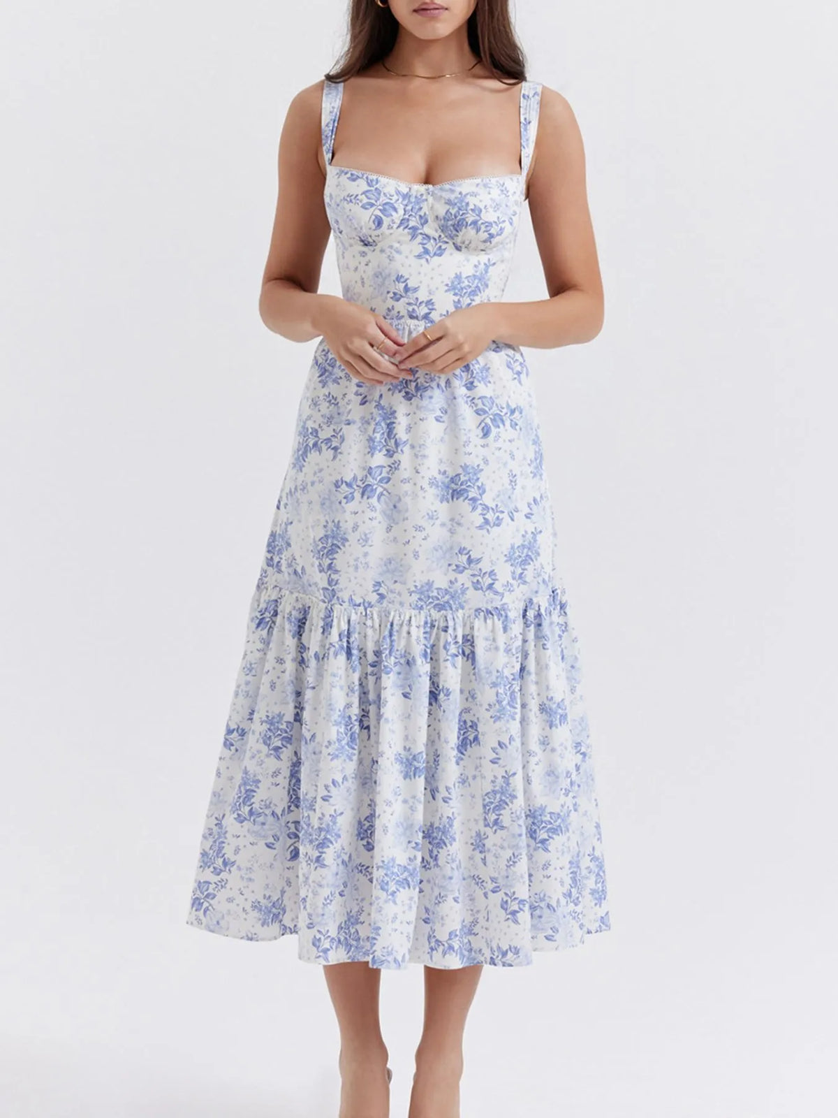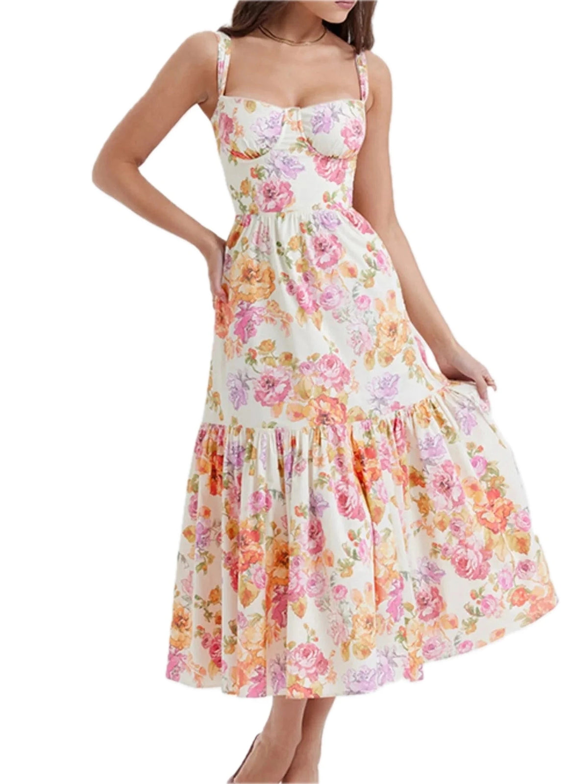 Women's Floral Print Sweetheart Neck Midi Dress 100% Polyester Ruffled Bodice Not Lined Easy Everyday Wear For Summer