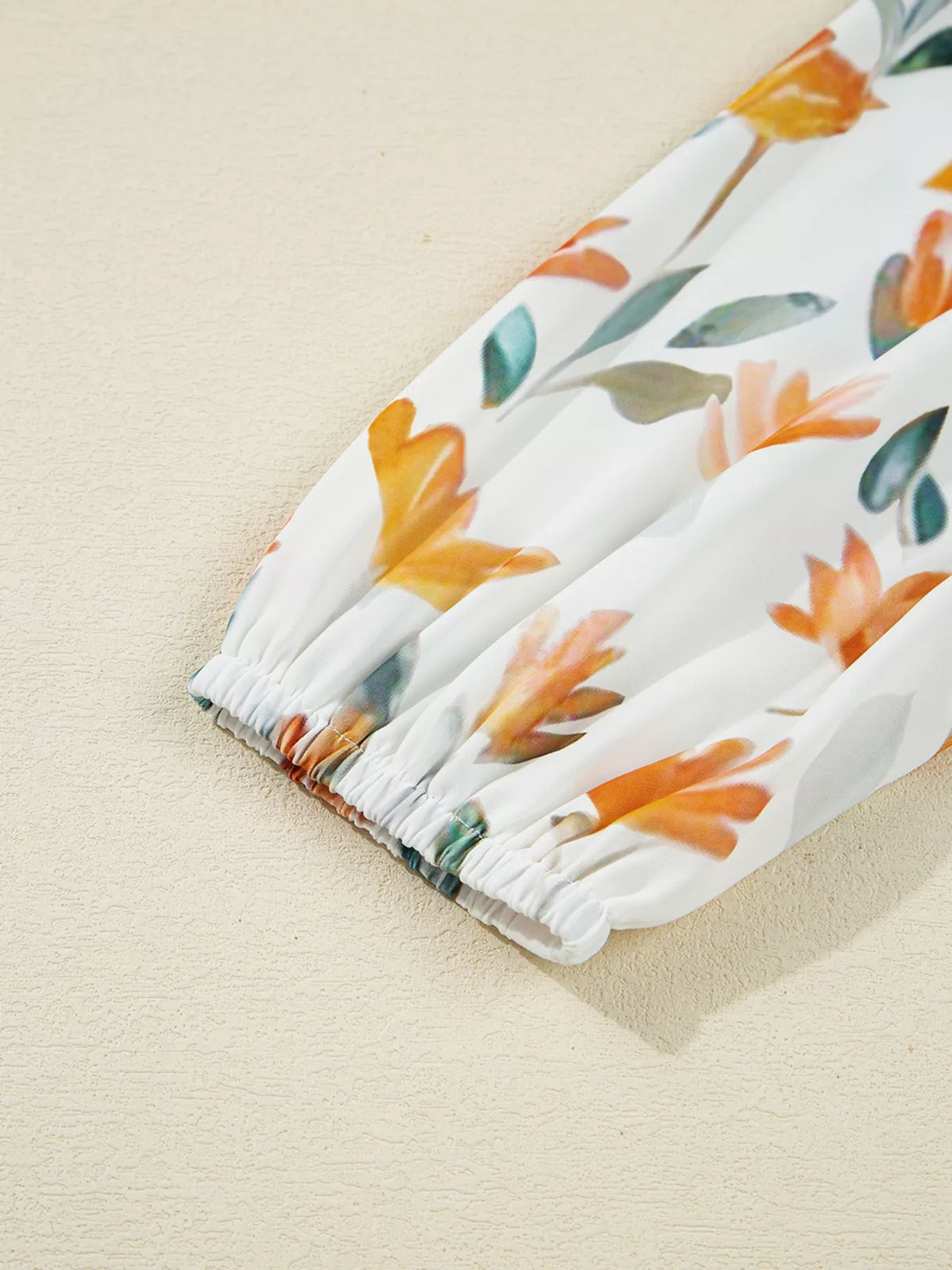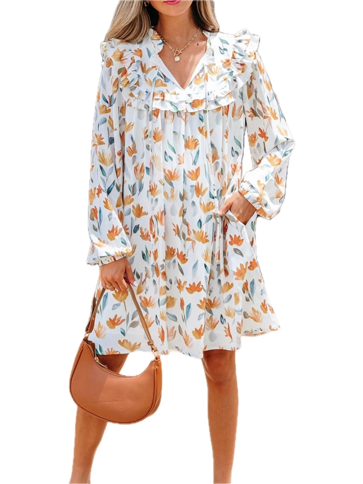 Women's Floral Print Tie Neck Frilled Detail Long Sleeve Mini Dress in 100% Polyester with Ruffles for a Cute Look