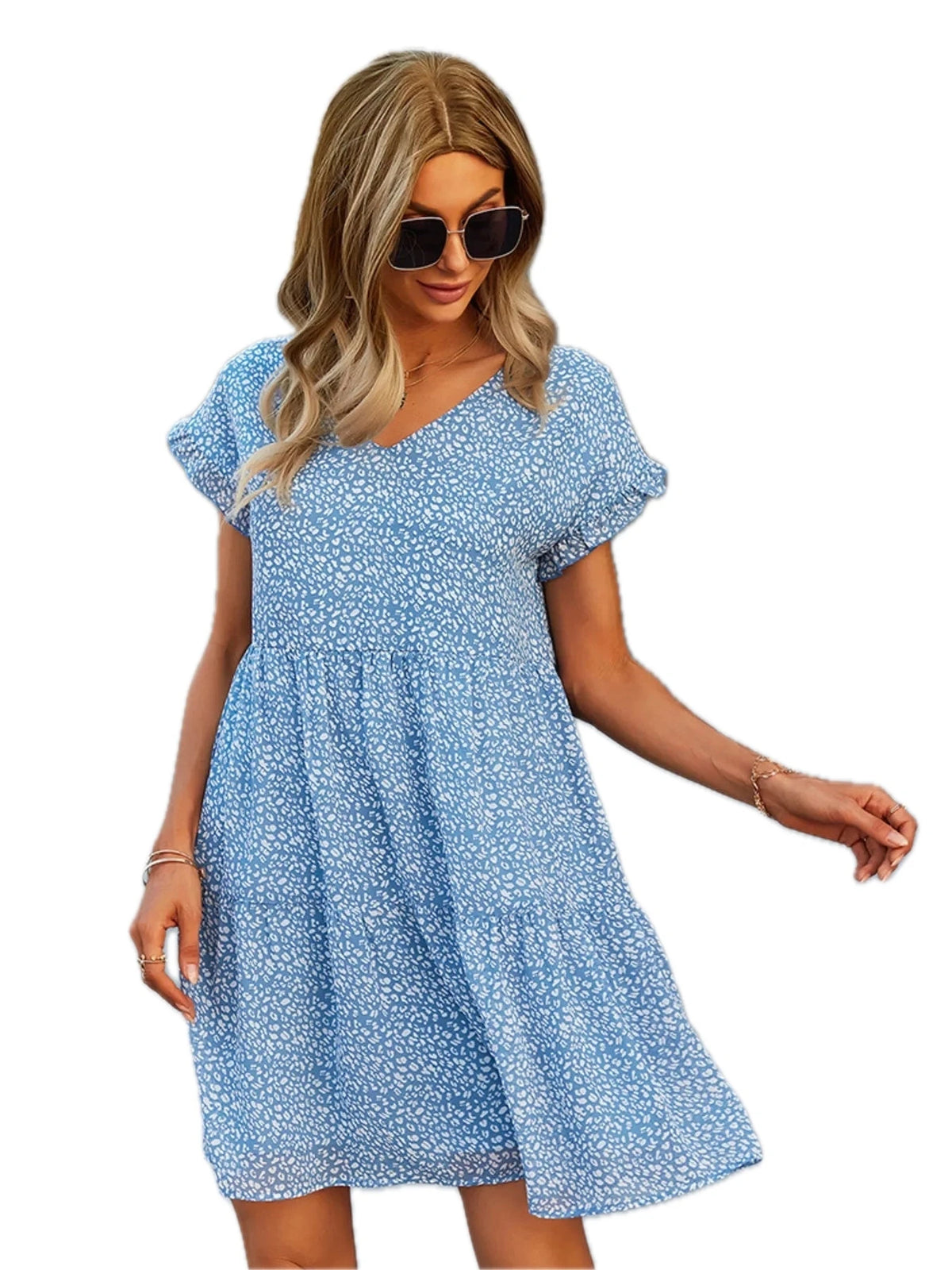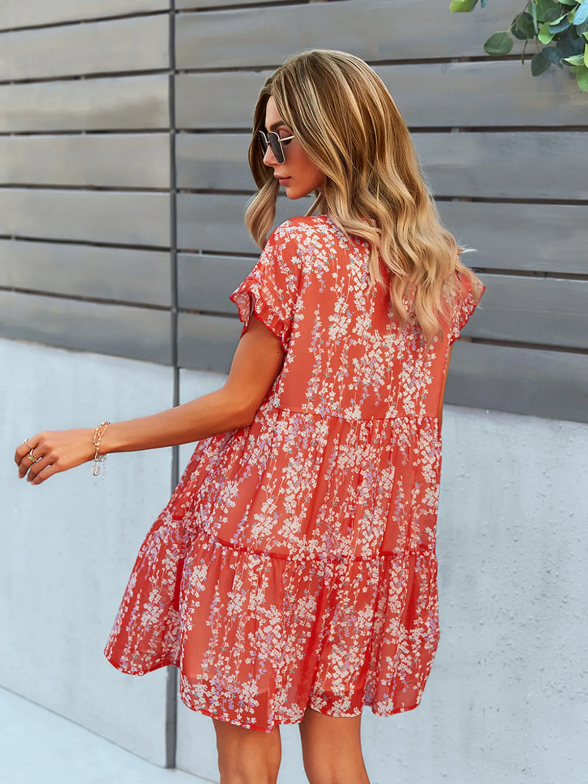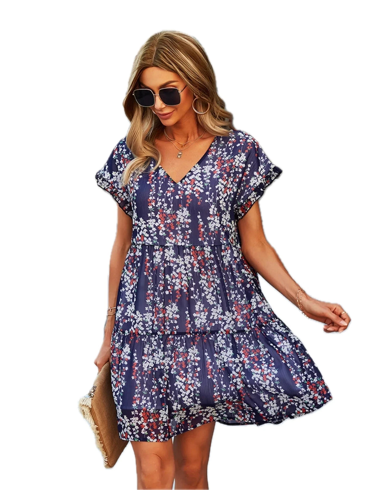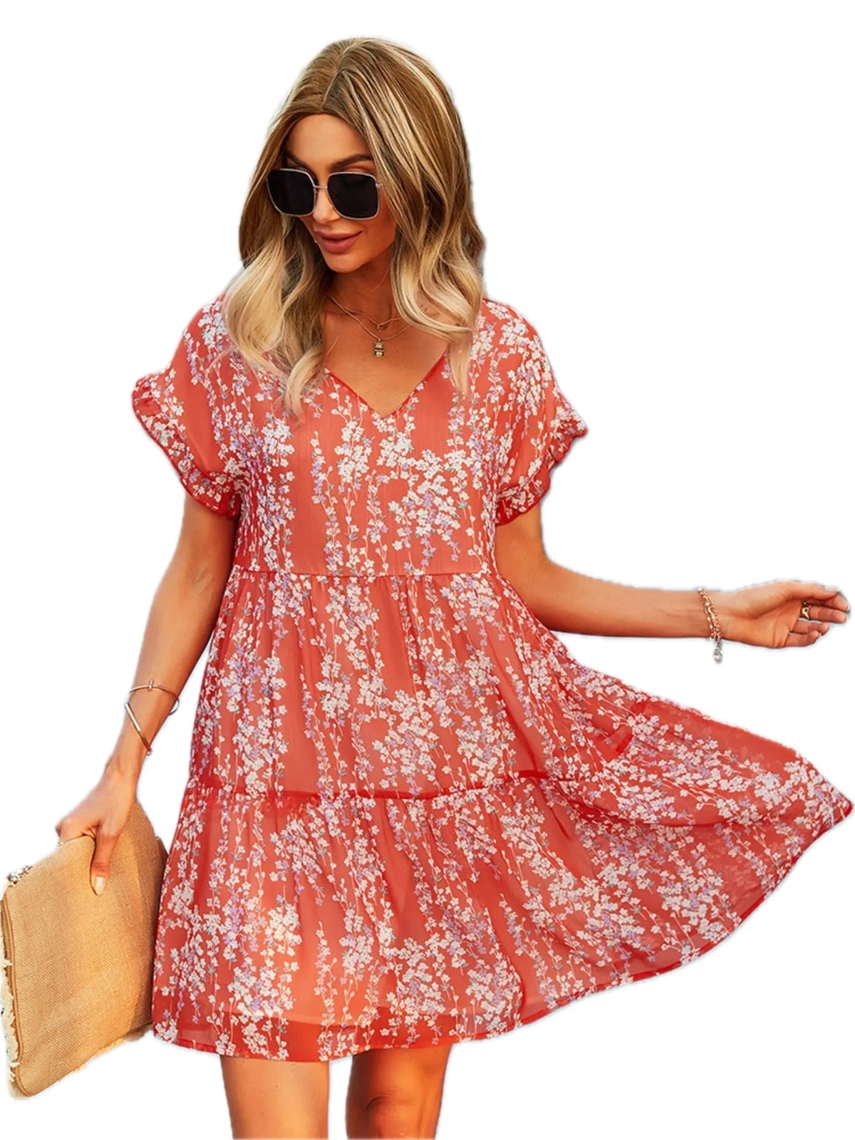 Women's Floral Print V Neck Ruffle Tiered Summer Mini Dress Lined 100% Polyester Easy Care for Everyday Casual Wear